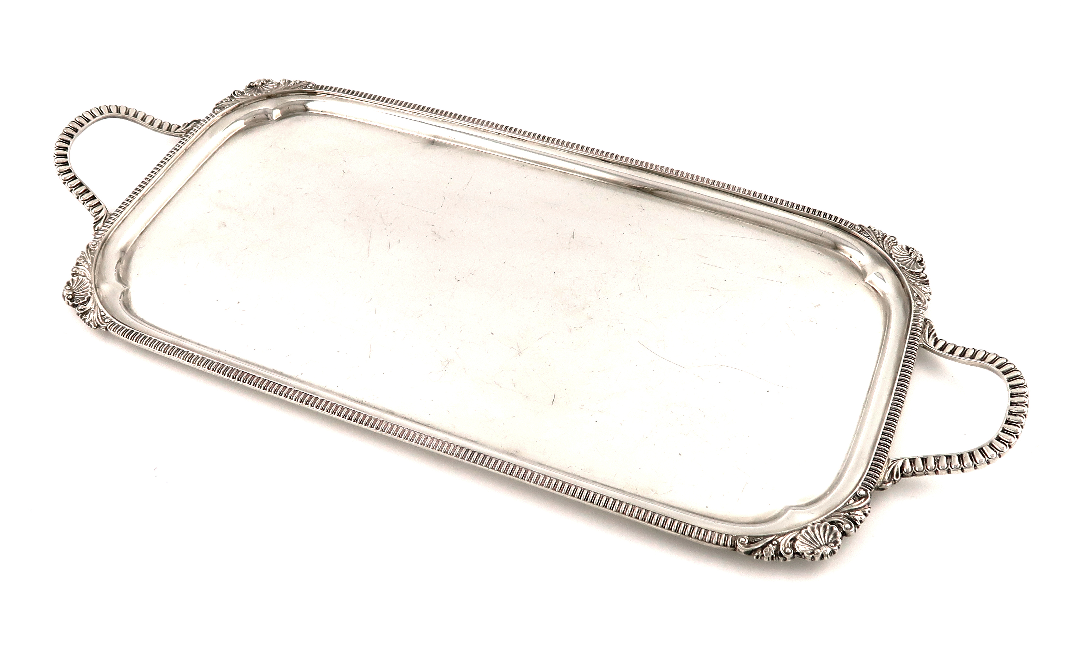 slender rectangular form, gadroon and foliate shell borders, length handle to handle 56.7cm, approx. weight 52.5oz.