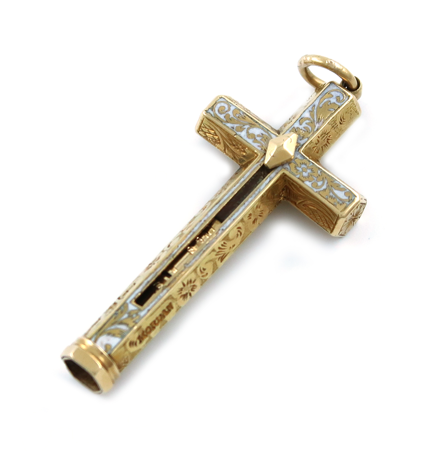 modelled as a cross, with white enamel decoration, and engraved with foliate scrolls, with a ring attachment, length closed 3.8cm.