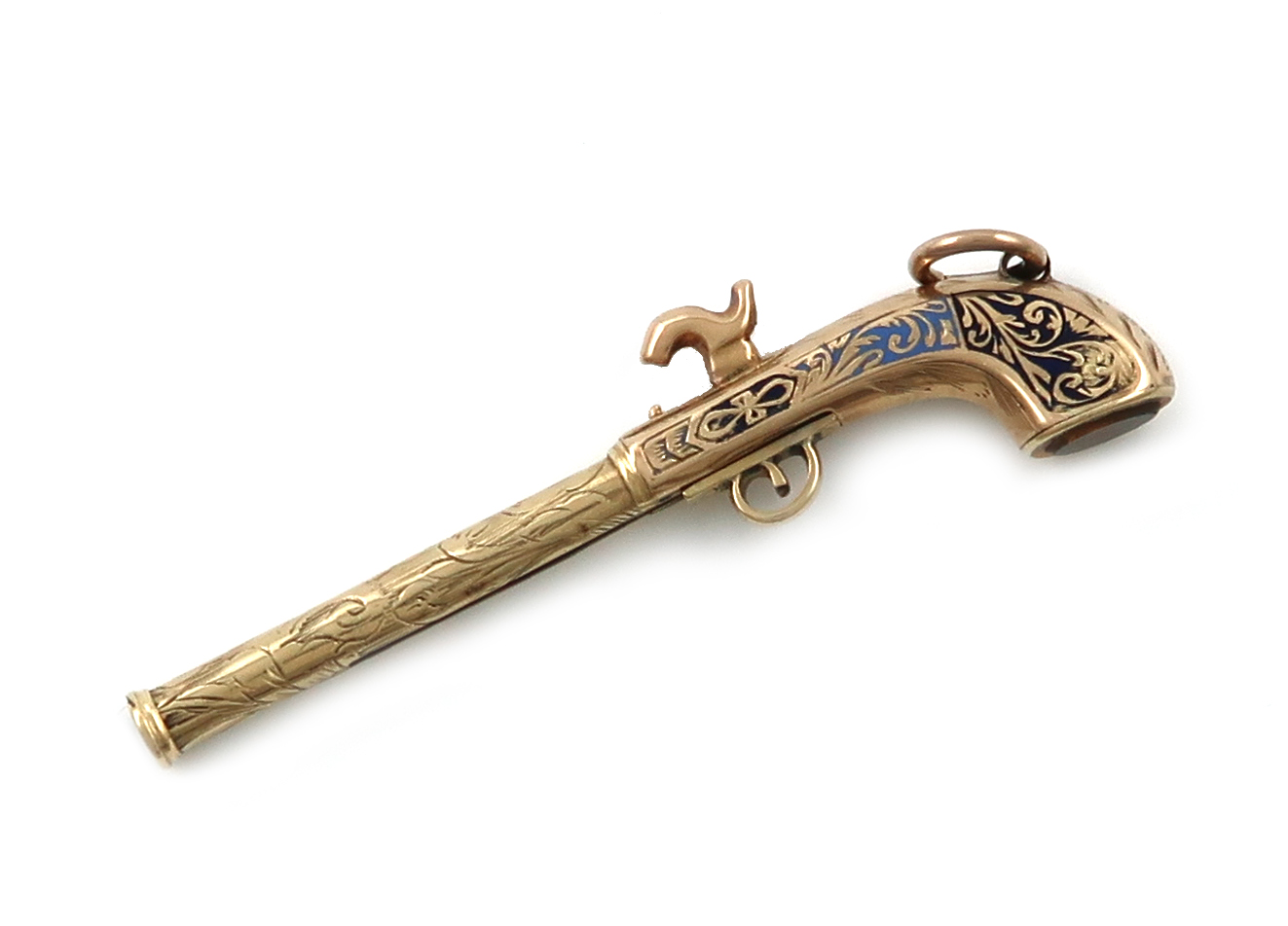 modelled as a pistol, with two colour enamel decoration and engraved foliate scrolls, the end of the handle set with a citrine, with a ring attachment, length closed 5.2cm.