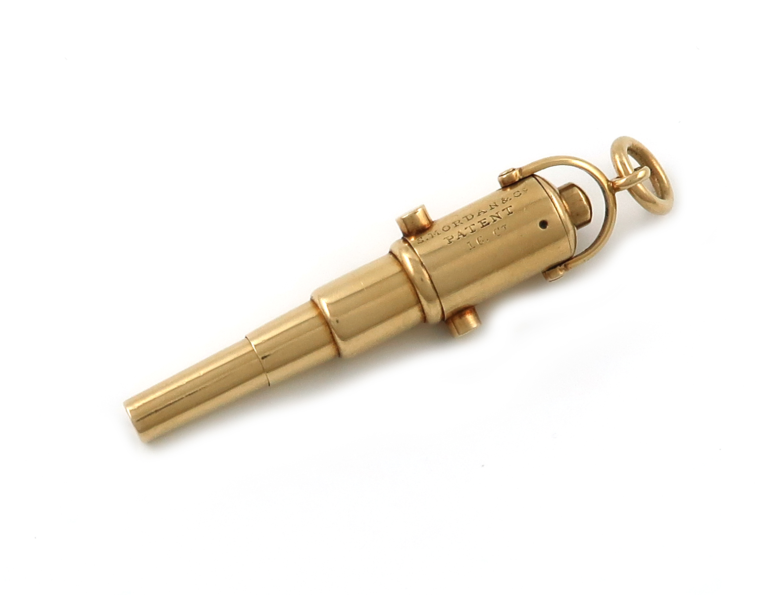 modelled as a canon, with a hinged ring attachment, length closed 6cm.