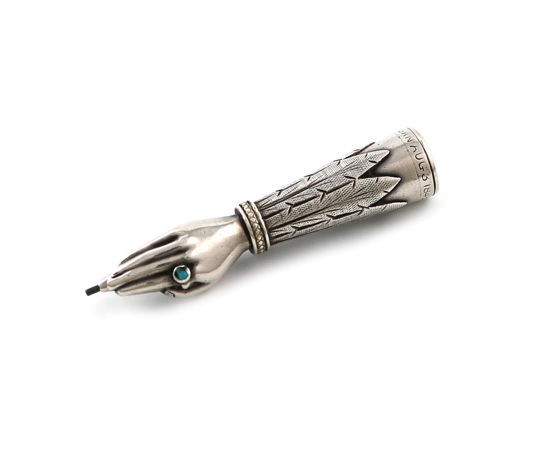 modelled as a hand and sleeve, tapering form, with scroll decoration, the finger with a turquoise ring, and with a ring attachment loop, length closed 3.8cm.