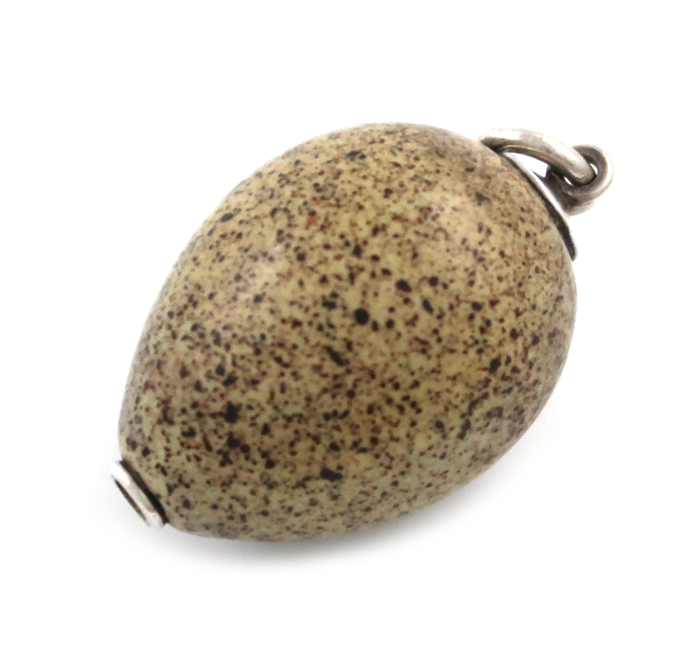 modelled as a bird's egg with mottled brown decoration, with a ring attachment, length 3.2cm.