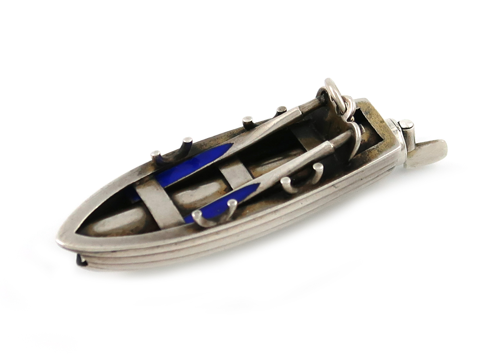 modelled as a rowing boat, with dark blue enamelled oars, with a rudder and a ring attachment, length closed 4cm.