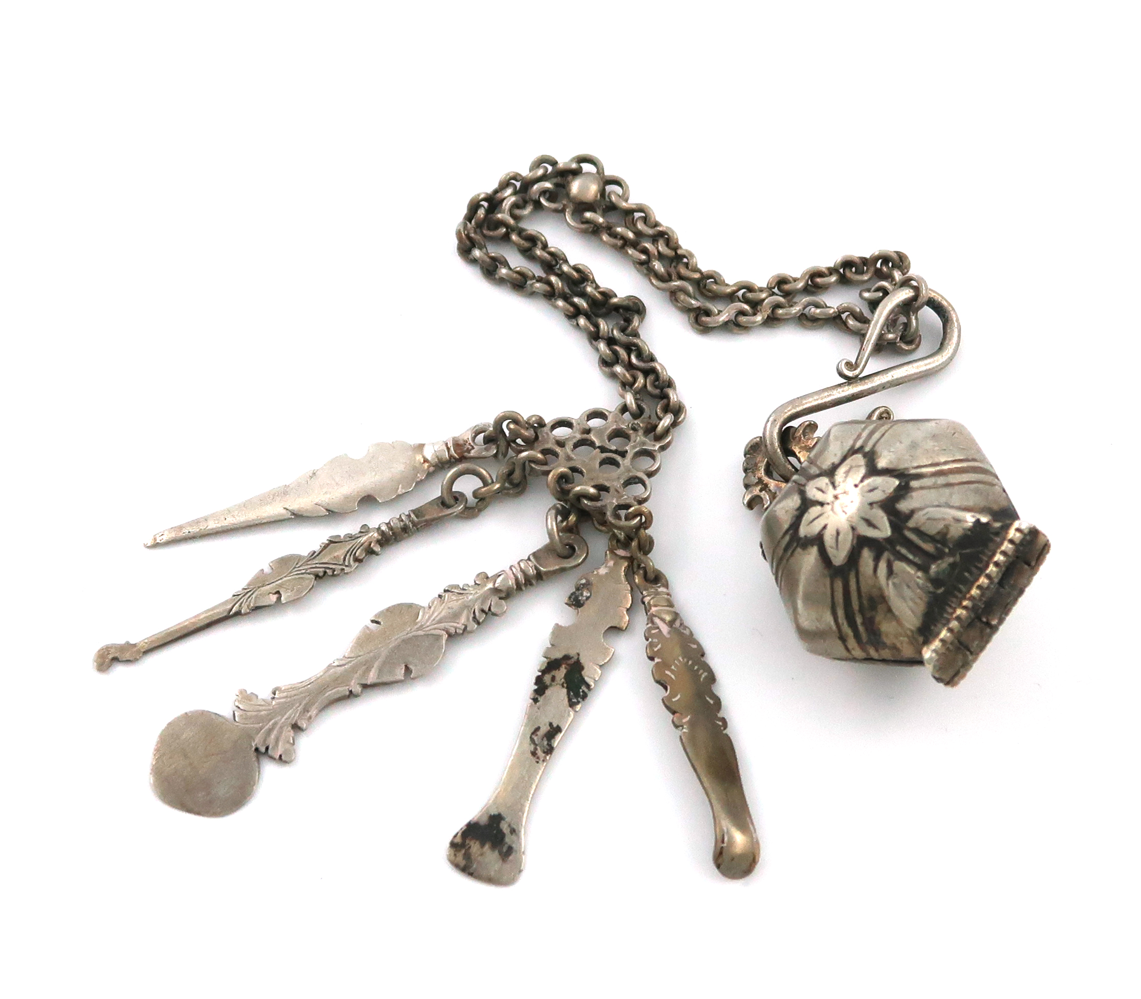 the box of hexagonal form, with a foliate motif, the hanging chain with an ear cleaner, hook, spike and two other implements, total length 22cm.
