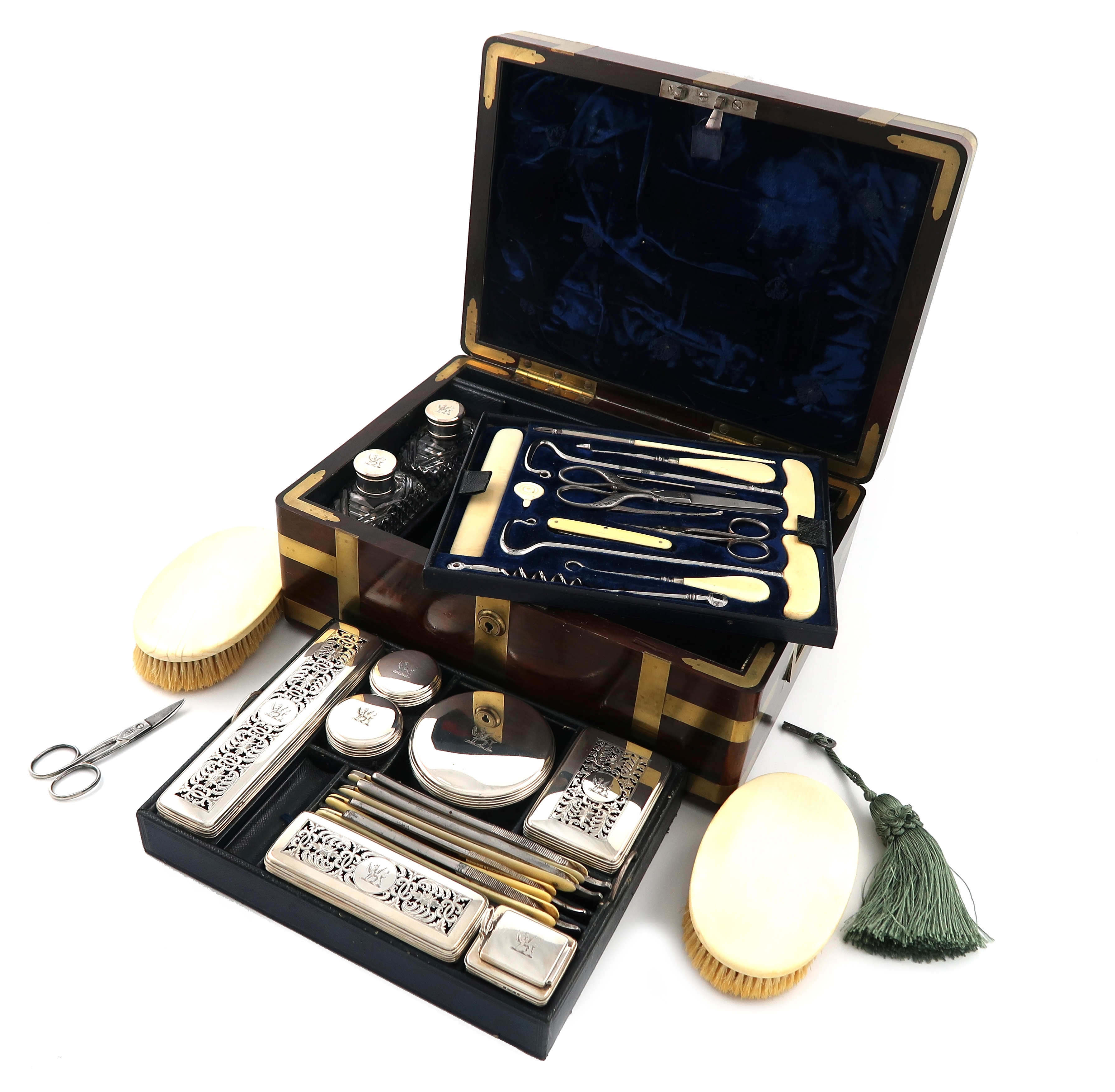 some of the covers with pierced and engraved decoration, with a crest, comprising: a pair of cologne bottles, three circular and four rectangular toilet boxes, glass bases, plus four ivory razors, the pull-out tray reveals another tray with various implements, some with ivory, including a pair of boot hooks, a pen, plus a pair of ivory military brushes, the interior of the hinged cover with a mirror and stationary case, in a fitted brass bound rosewood case, the cover with a crest, approx. weighable 7.5oz., length 32cm.