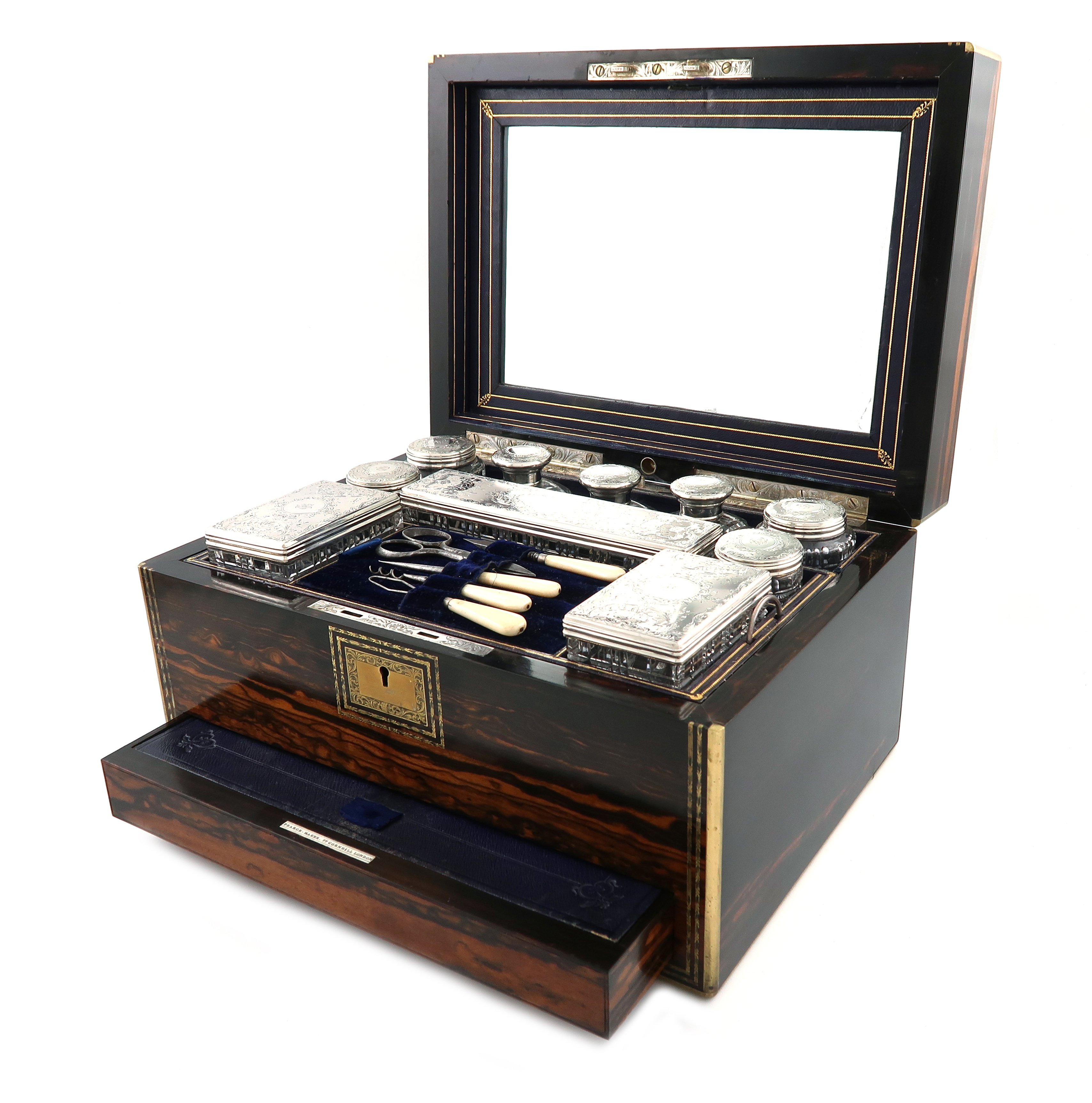 the covers with engraved foliate decoration, and with a monogram, comprising: three scent bottles, four toilet jars, and three toilet boxes, with a pull-out tray, four ivory manicure items and a pair of scissors, with a push-button secret jewellery drawer, the inside of the hinged cover with a stationary wallet and mirror, in a fitted coromandel case with brass banding and with a central initial, approx. weighable 6.5oz.