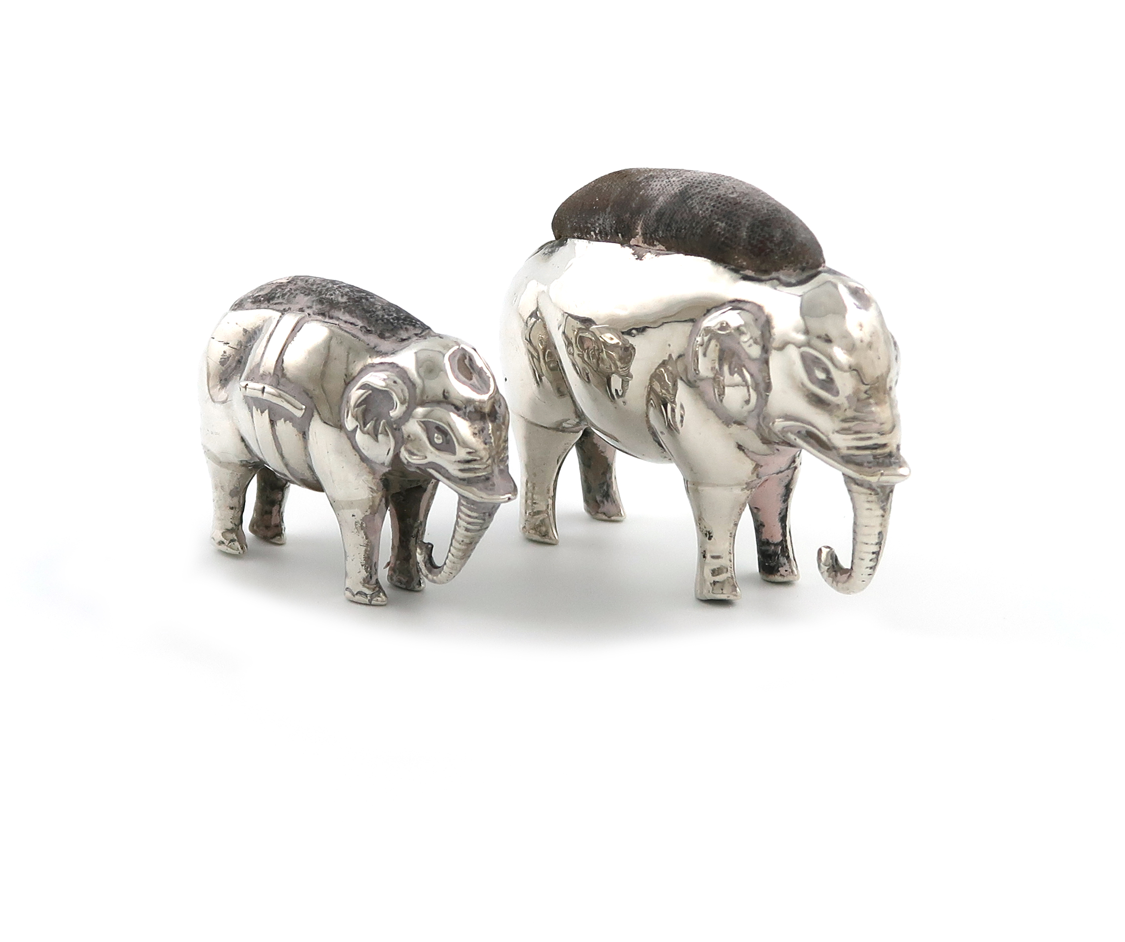 Two Edwardian novelty silver elephant pin cushions,