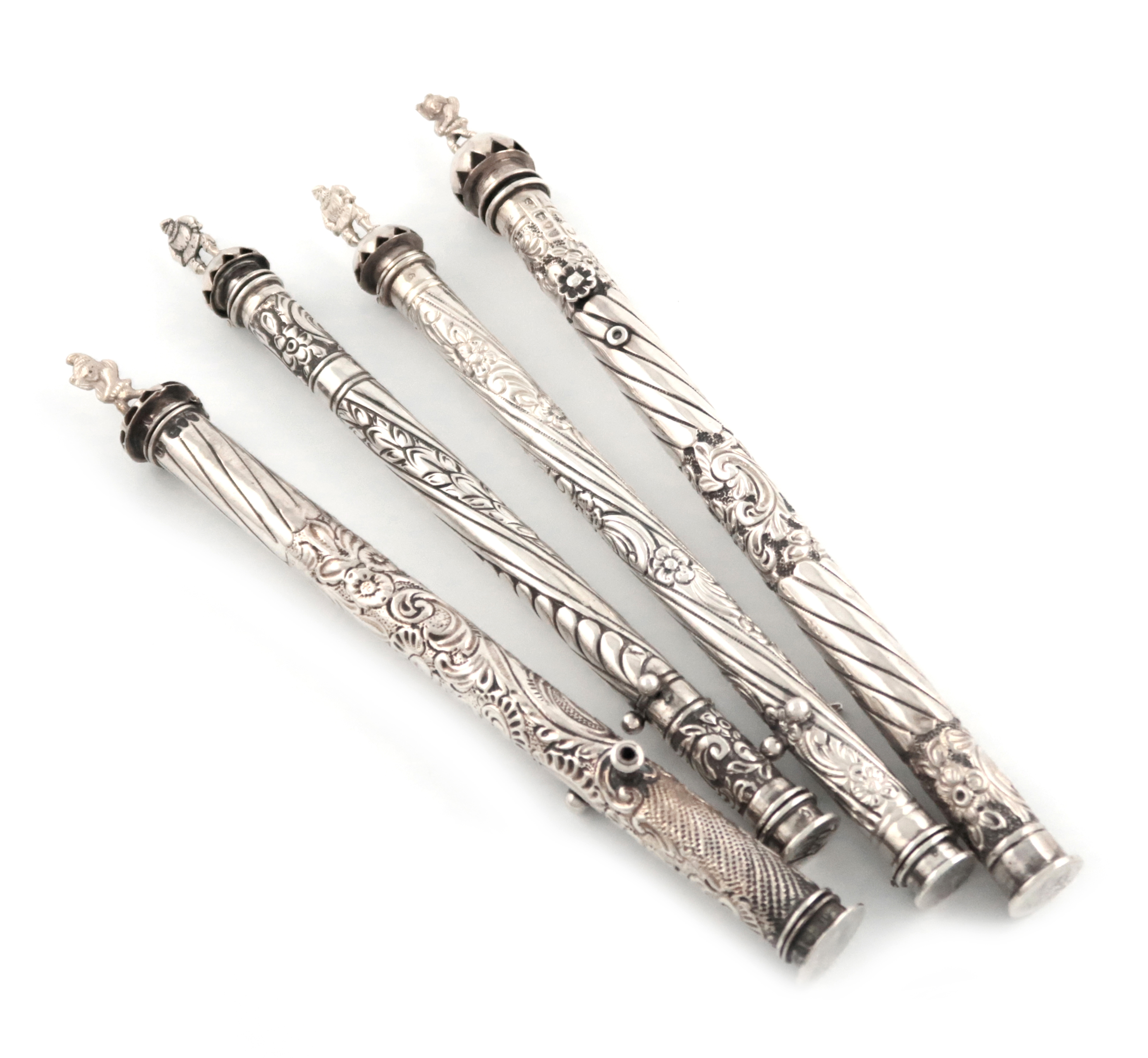 cylindrical form, embossed foliate scroll decoration, two of the hinged covers with a pixie finial, the other two with a figural finial, the base cover of three with a plain matrix, the other engraved with initials, approx. weight 5.1oz. (4)