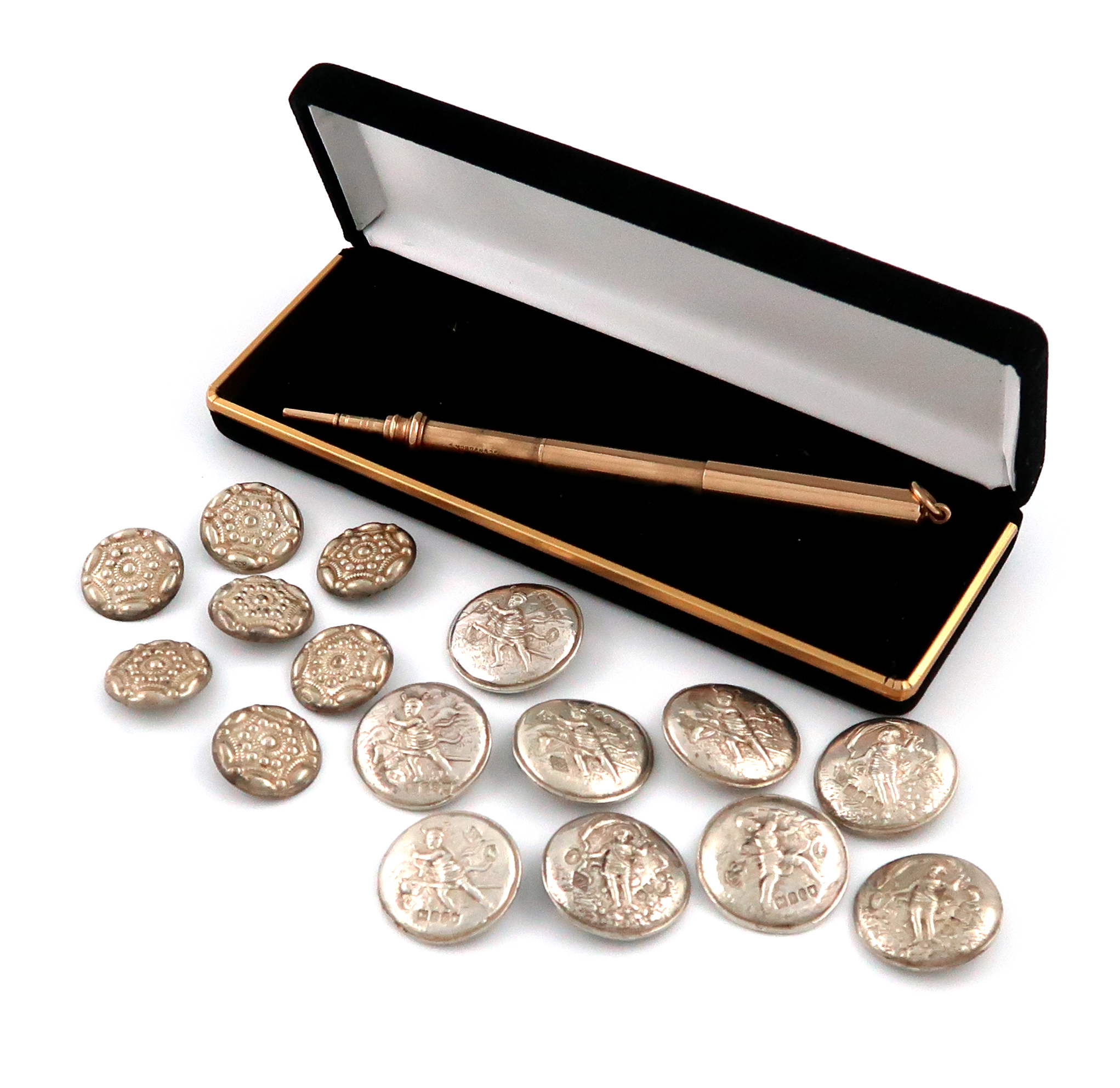 three section telescopic form, ring attachment, plus a set of nine silver buttons and a further set of seven. (17)