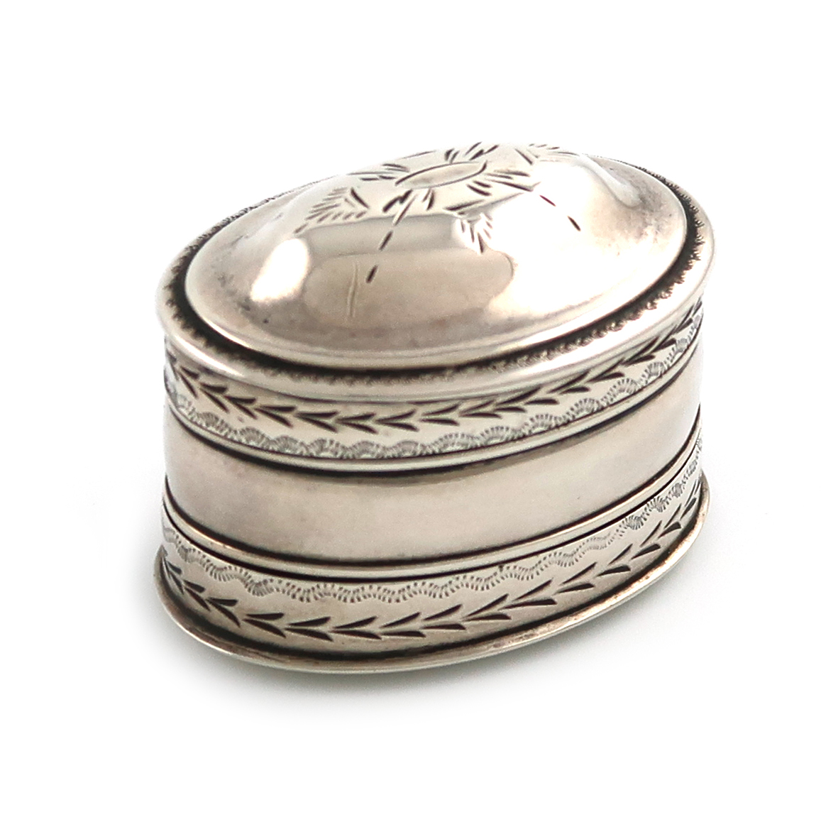 oval form, pull-off base and domed cover, engraved decoration, length 3.5cm, approx. weight 0.6oz.