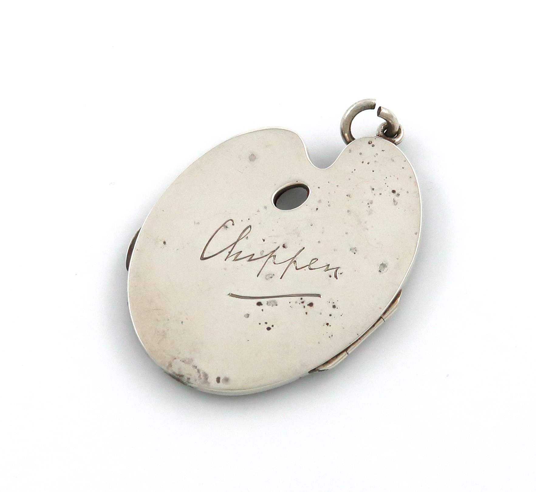 modelled as a palette, with seven paint compartments and a compartment for a paint-brush, gilded interior, with a ring attachment, inscribed 'Chipper', length 7cm, approx. weight 0.8oz.