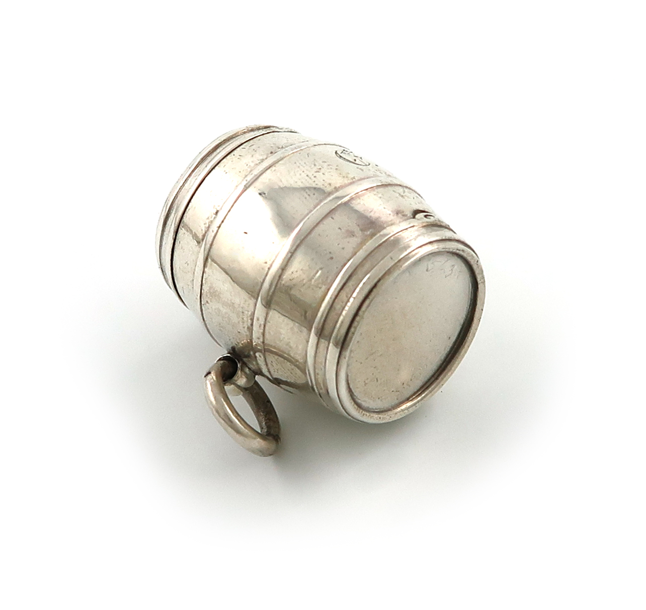 barrel form, with banded decoration, one hinged end opens to reveal a pierced silver-gilt grille, the other opens to reveal a compartment, with a ring attachment, length 2.7cm, approx. weight 0.7oz.