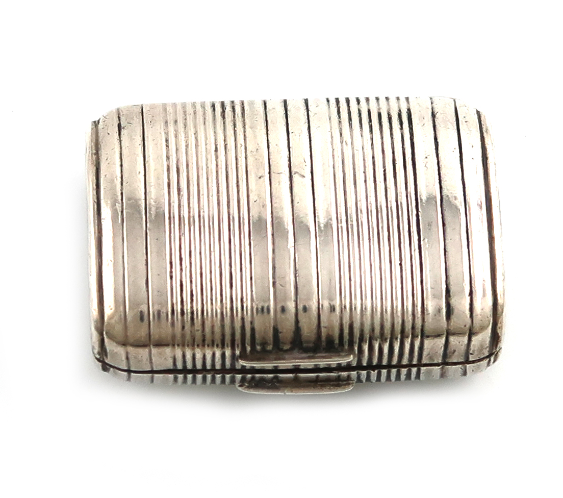 rectangular form, fluted decoration, the interior with a silver-gilt grille pierced and engraved with foliate scroll decoration, length 3.2cm, approx. weight 0.4oz.