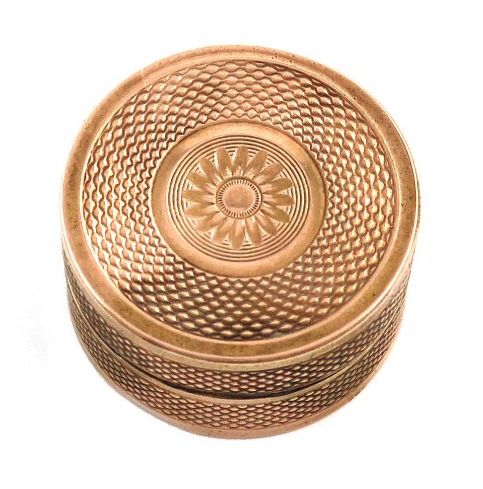 circular form, engine-turned decoration, the interior with a hinged pierced grille, diameter 2.6cm, approx. weight 12.3g.
