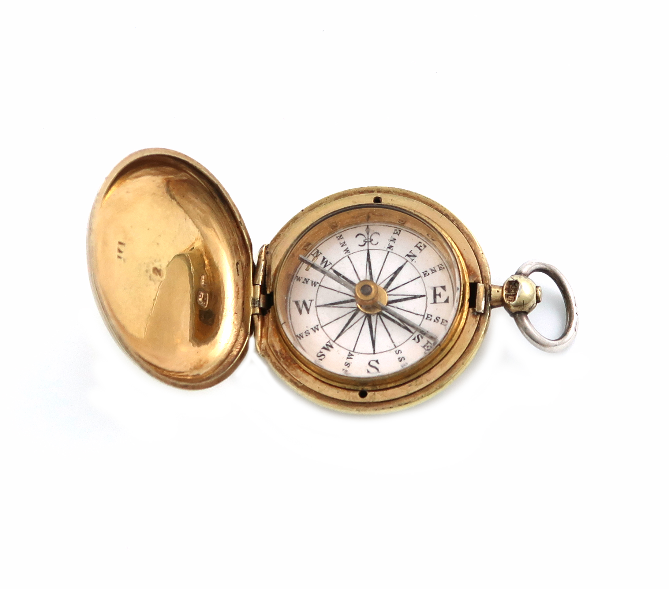 circular form, the hinged cover opens to reveal the compass, the case with reeded borders and initialled, with a ring attachment, diameter 3.2cm.
