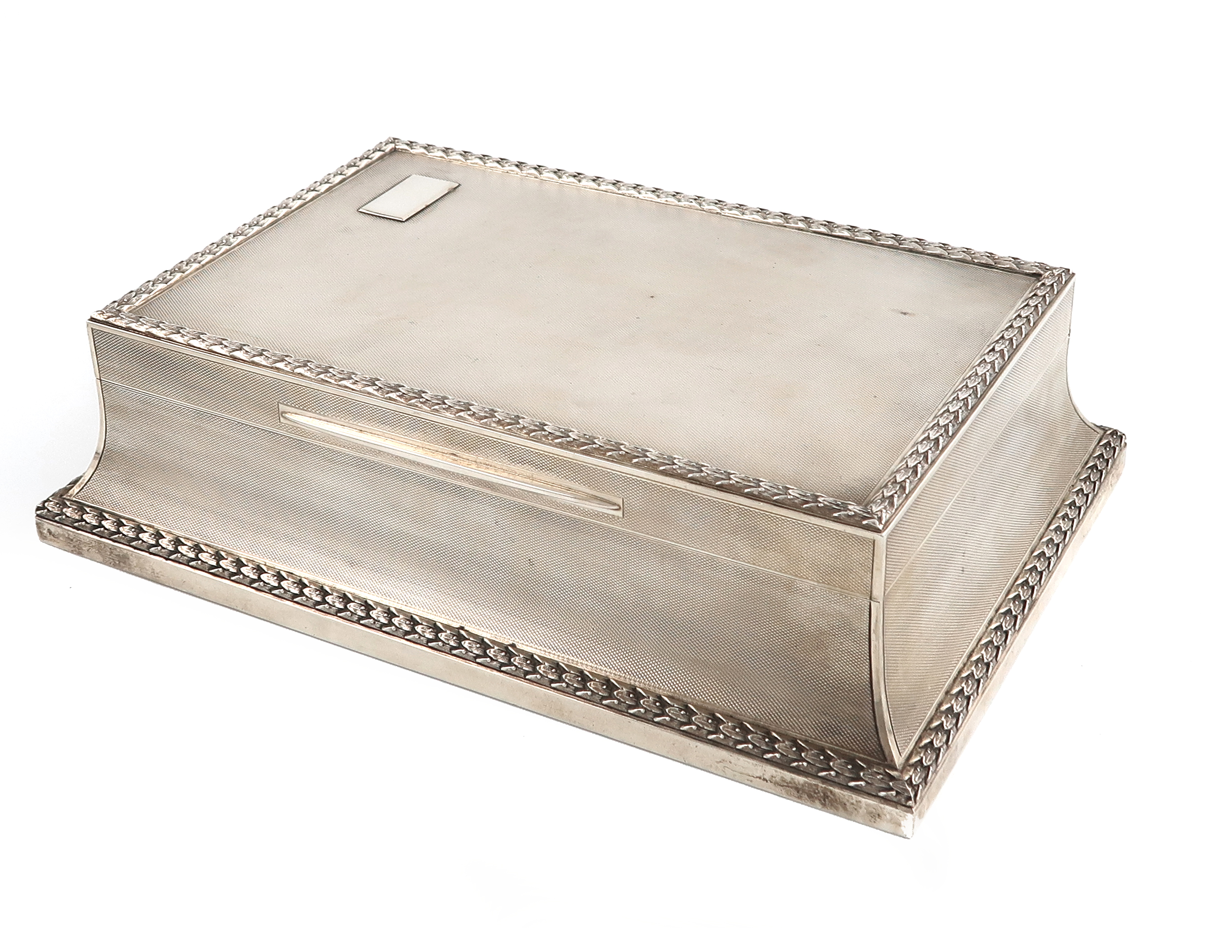 tapering rectangular form, engine-turned decoration, swag borders, the hinged cover with a vacant cartouche, wood lined, length of base 29cm.