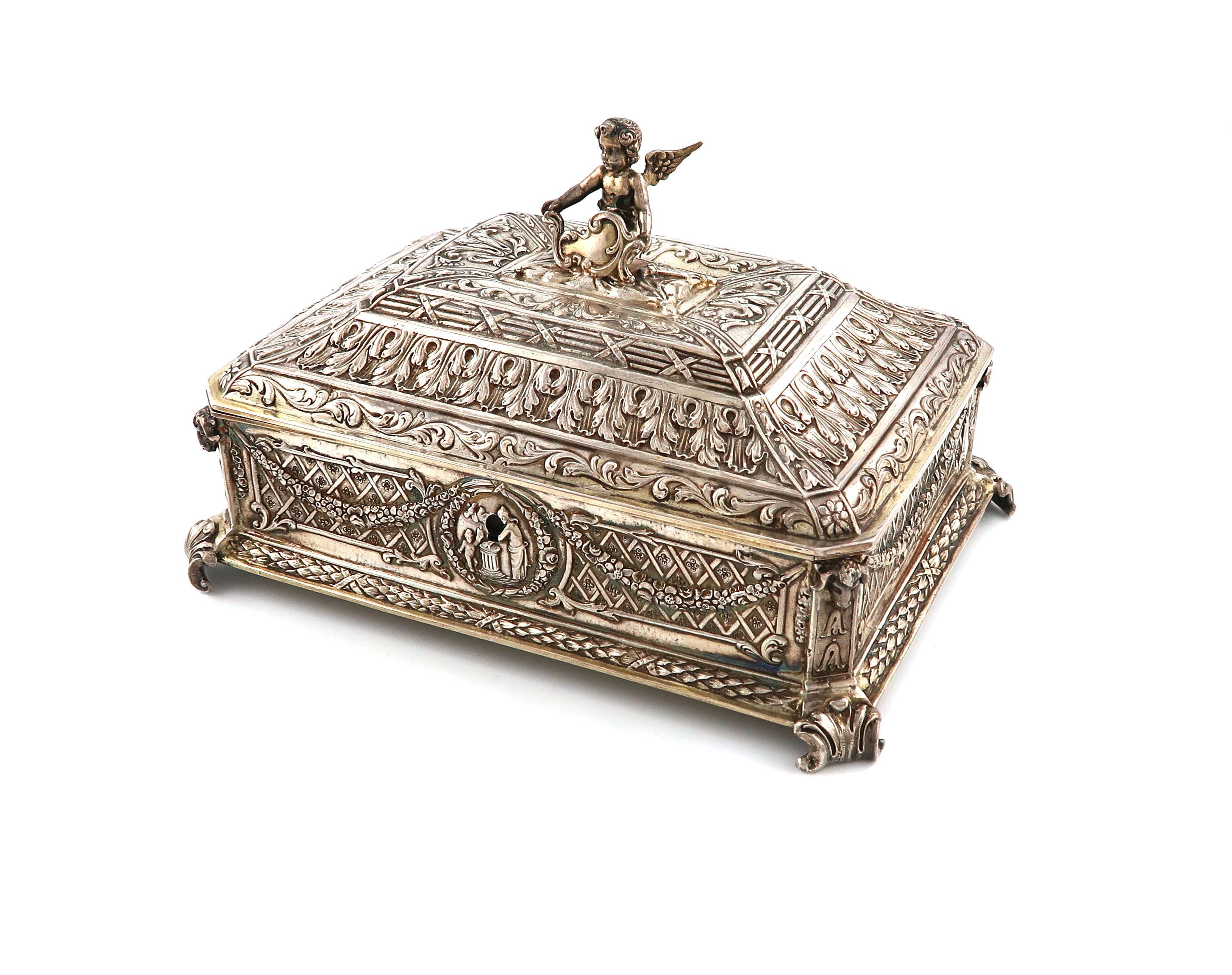 rectangular form, the sides with trellis and garlands of flowers, central figural lock, the hinged cover with acanthus leaf and foliate scroll decoration and with a cherub finial holding a scroll cartouche, with traces of gilding and with a gilded interior, on four foliate bracket feet, length 22cm, approx. weight 32oz.