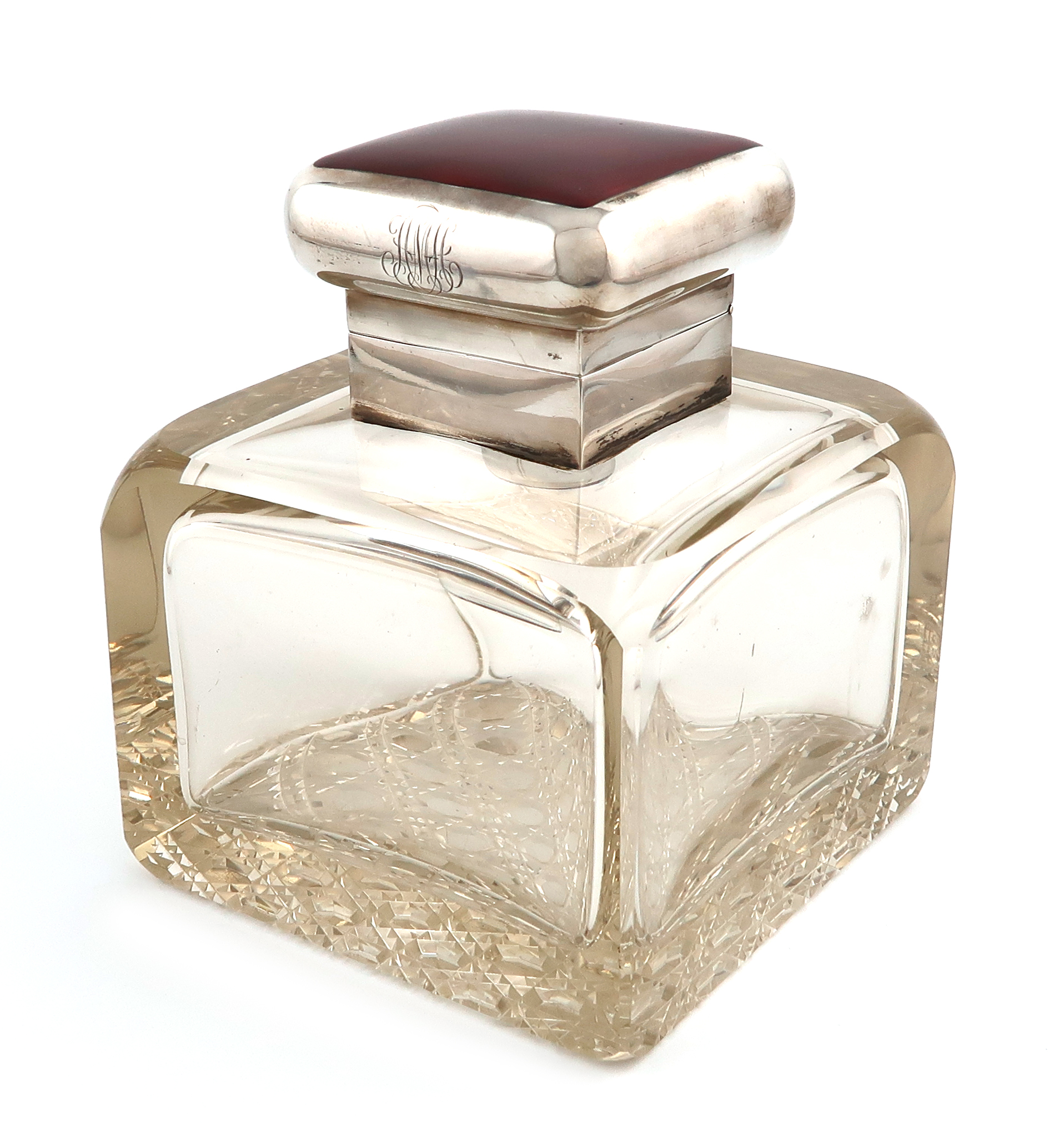 A large silver and enamel mounted glass inkwell,