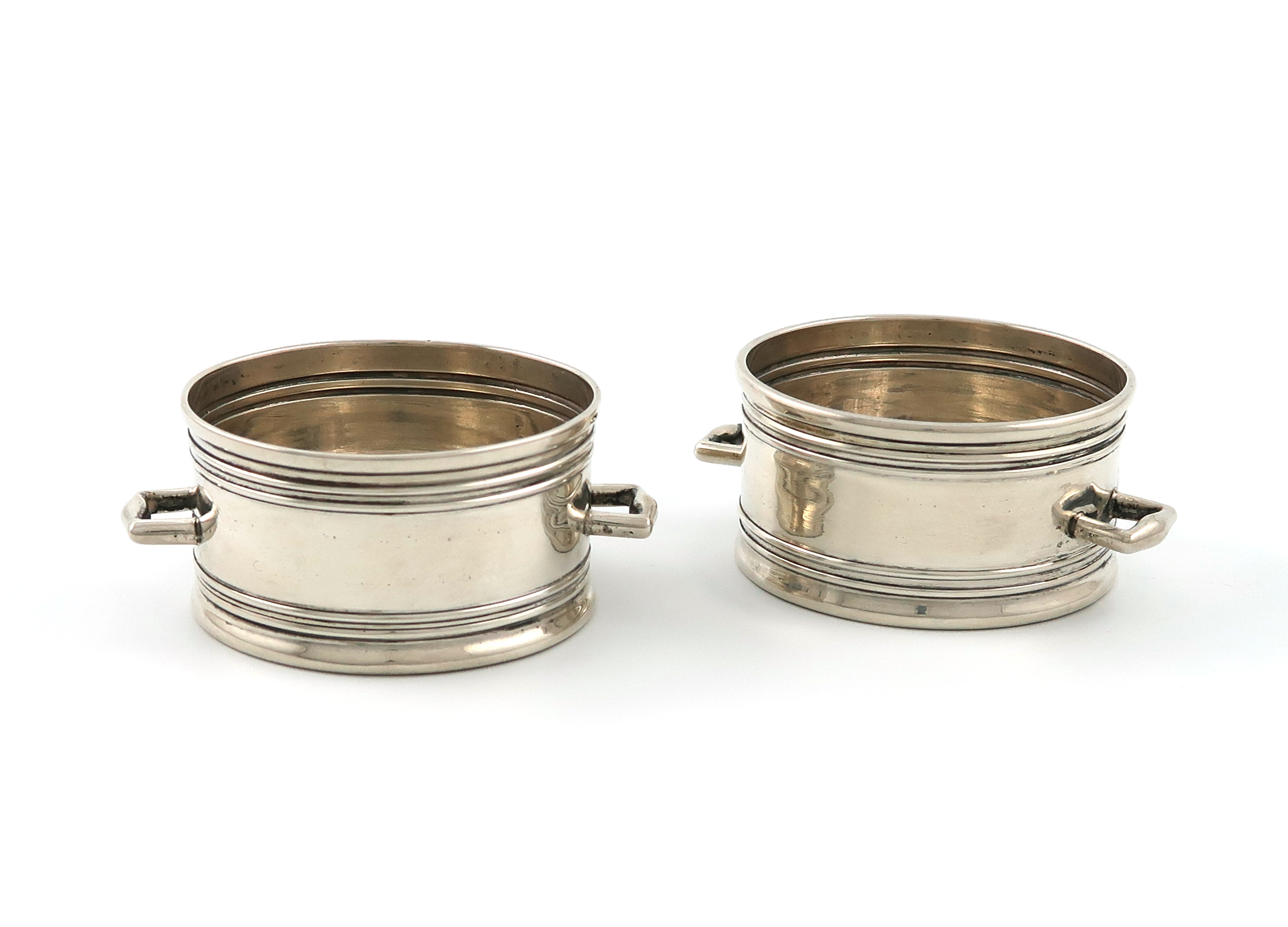 circular form, side handles, diameter 6cm, approx. weight 2.5oz. (2)