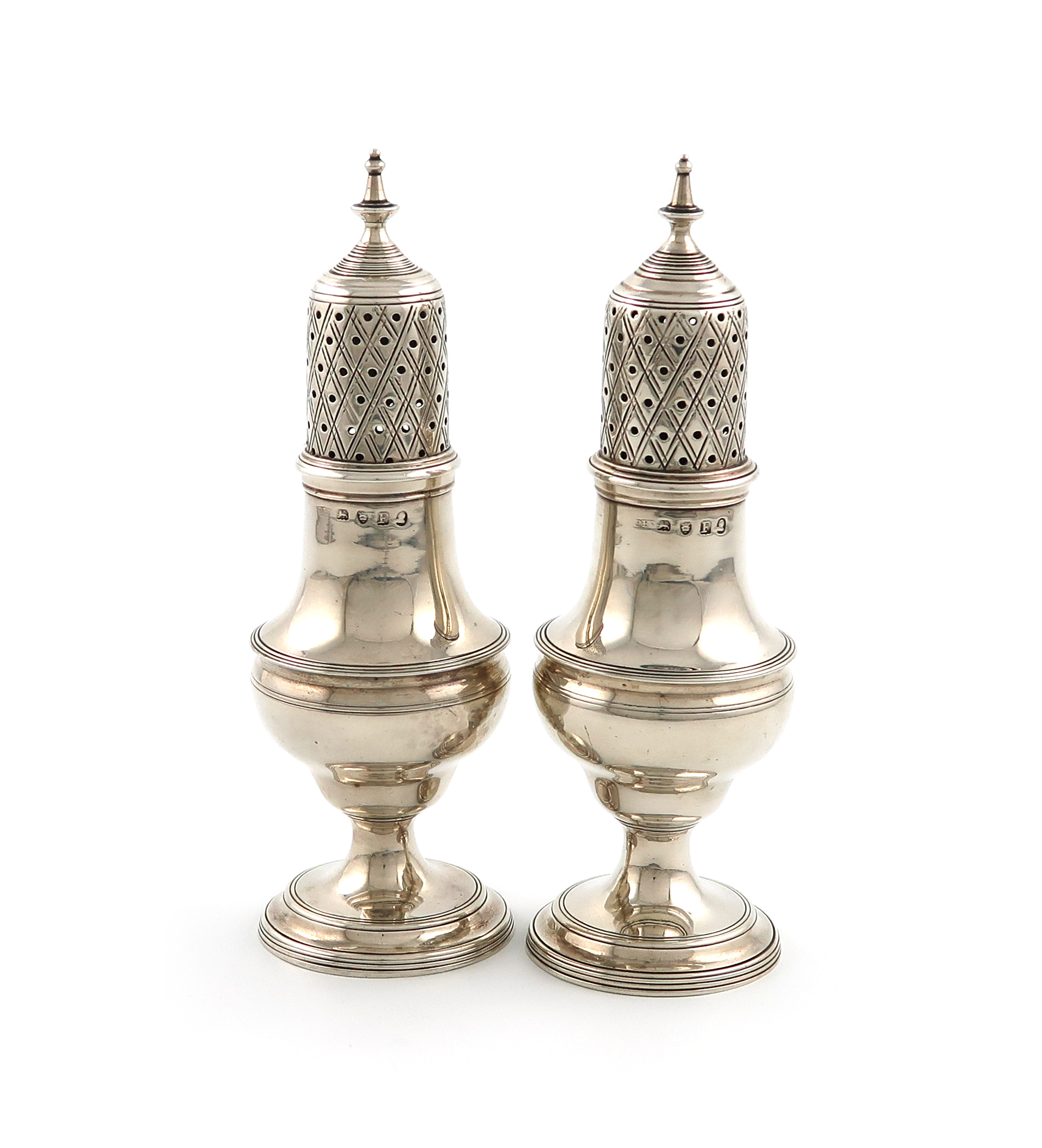 baluster form, reeded borders, the pierced covers with an urn finial, on a raised circular foot, height 15.5cm, approx. weight 6.4oz. (2)