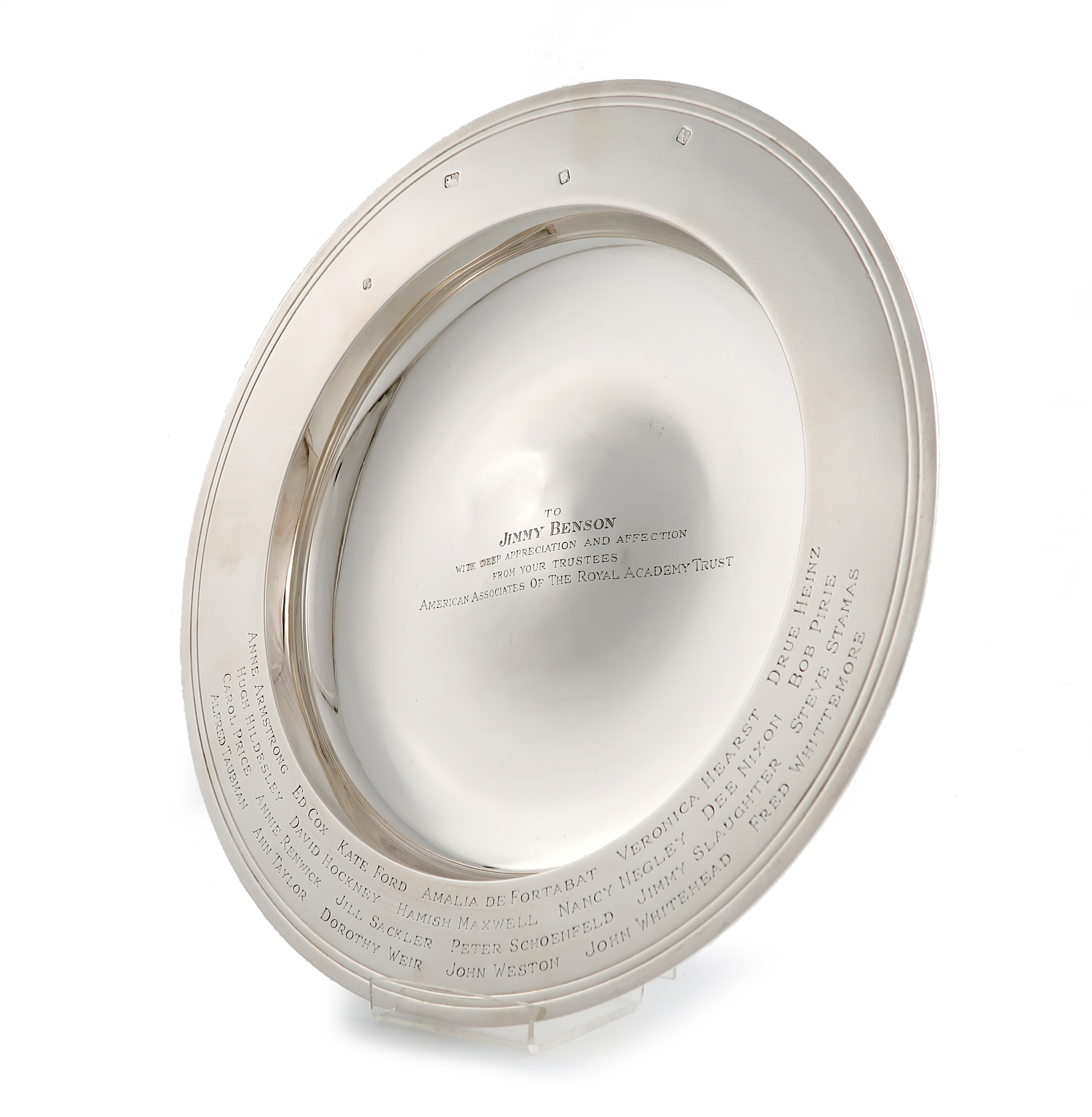 circular form, inscribed 'To Jimmy Benson with deep appreciation and affection from your Trustees American Associates of The Royal Academy Trust,' and with the names of the Trustees including David Hockney and Alfred Taubman, diameter 34.4cm, approx. weight 47.5oz.