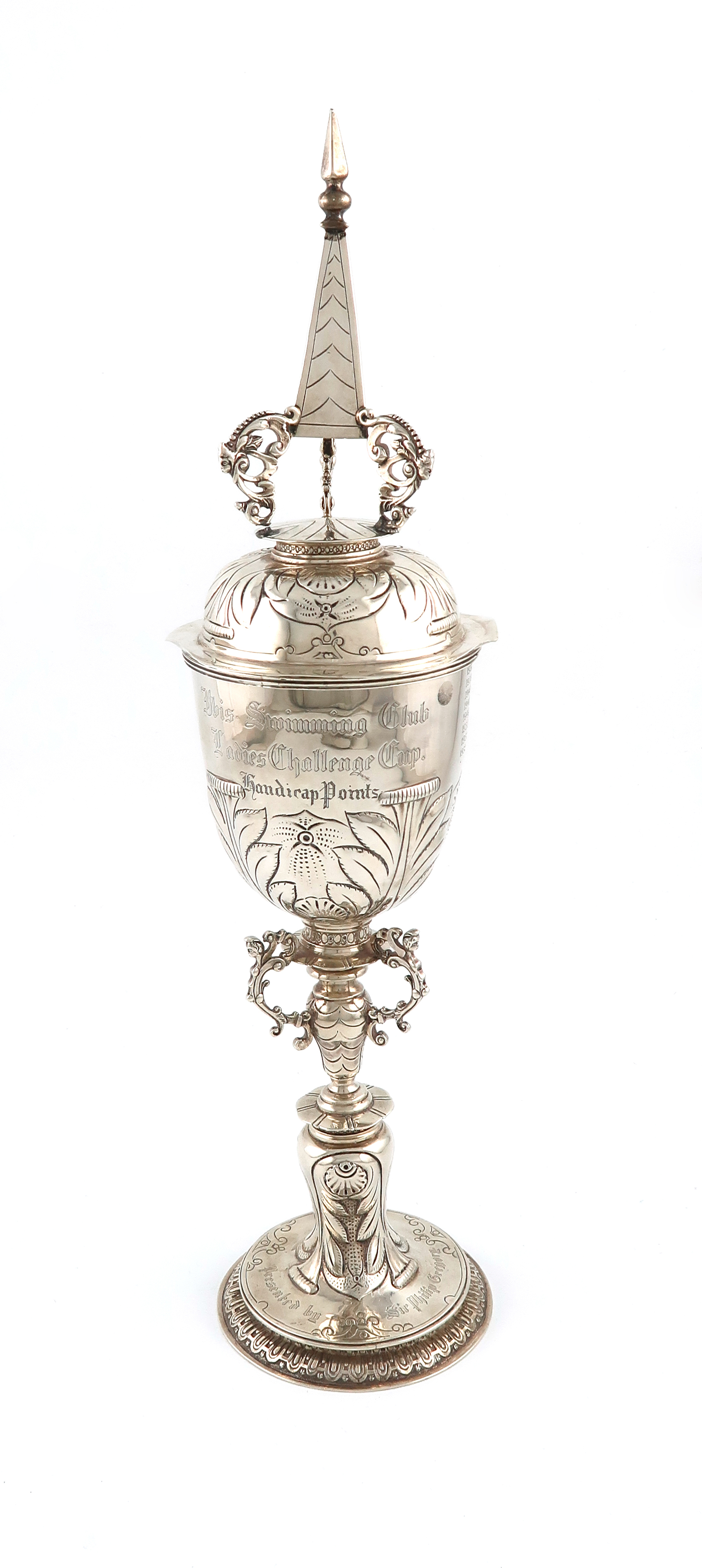 the circular bowl with acanthus leaf decoration, and inscribed with winner's names, on a baluster stem with scroll supports, on a raised circular foot, inscribed, the pull-off cover with a tapering steeple finial, height 42.2cm, approx. weight 26.5oz.