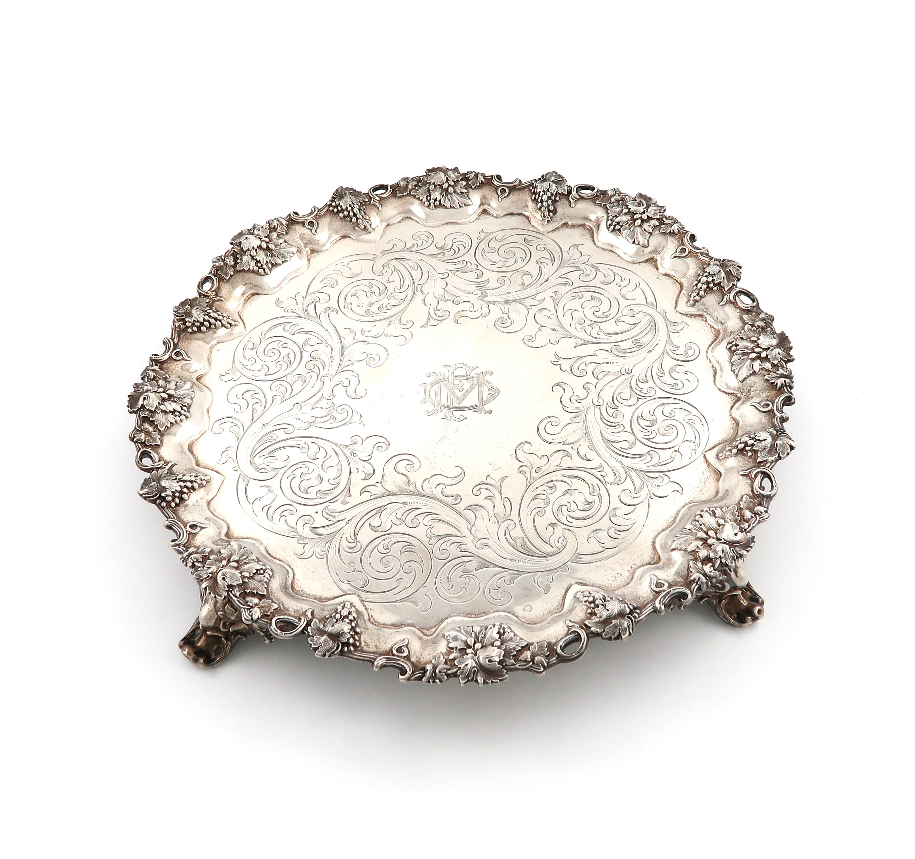 circular form, pierced grape vine border, the centre with engraved foliate scroll decoration, initialled, on four pierced foliate bracket feet, diameter 41.5cm, approx. weight 54.5oz.