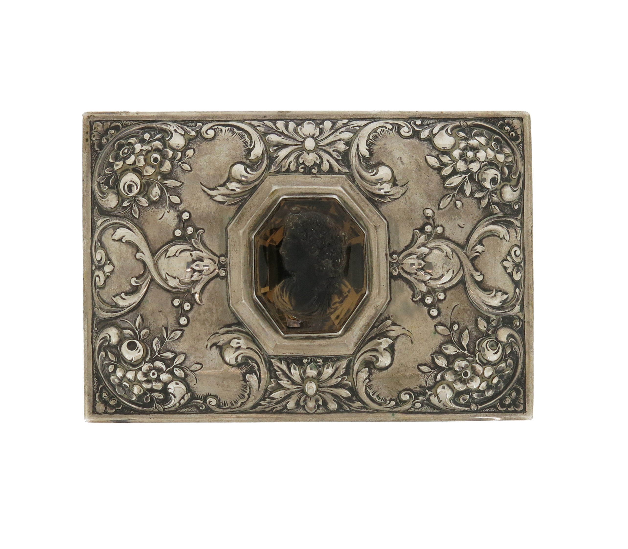 A continental silver rectangular casket, chased with foliate scroll decoration overall on four scroll feet with blue velvet lining, the hinged cover centred with an octagonal-shaped carved smoky quartz cameo depicting Diana, stamped 800 with other marks, 15cm wide