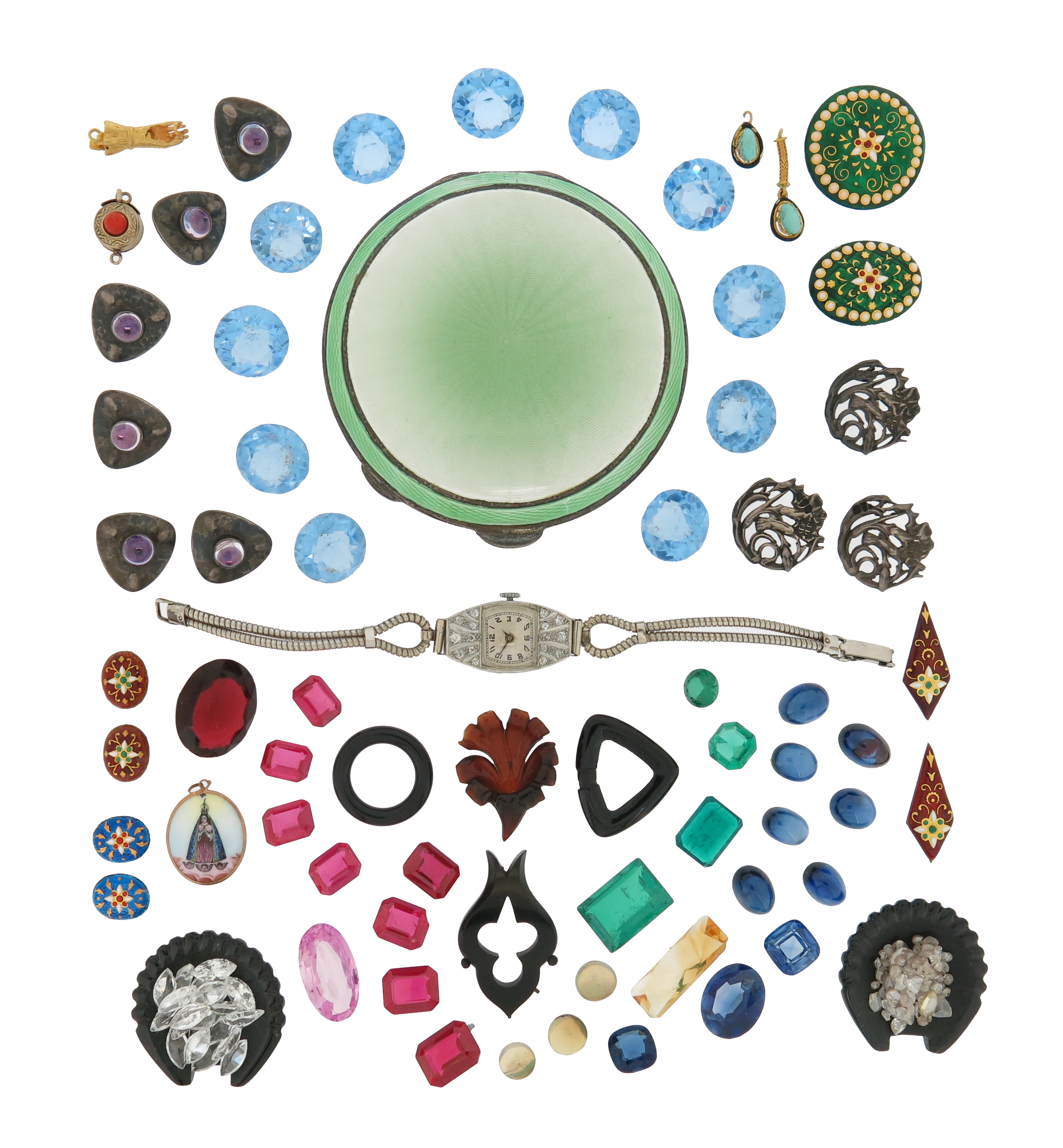 A collection of synthetic and mixed gemstones, including unset diamonds which weigh approximately 11.47cts, various sections of carved rock crystal and black onyx, a silver circular compact with green enamel decoration, a diamond-set platinum wristwatch and a collection of enamel plaques