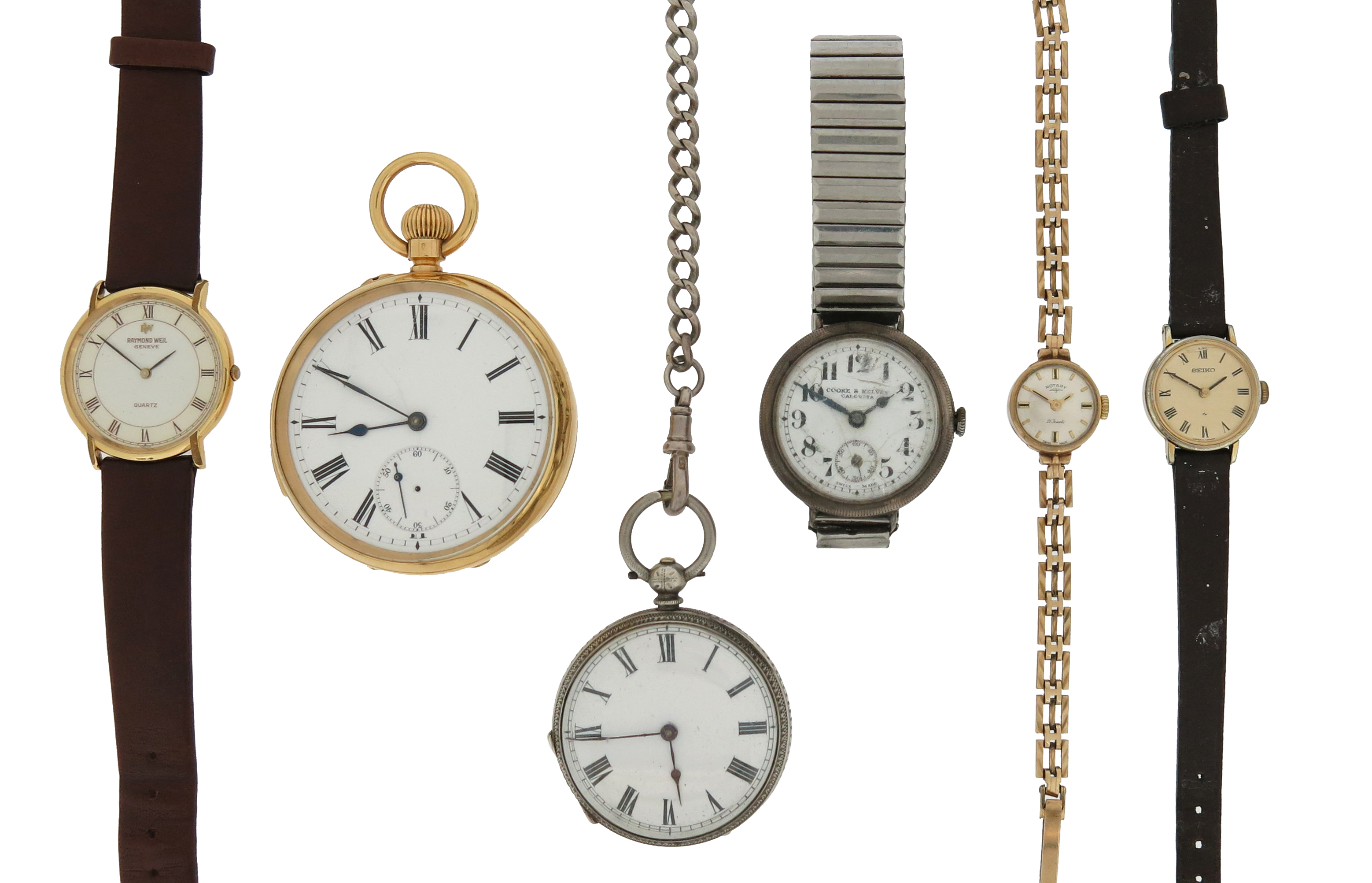 An 18ct gold open-faced pocket watch, with slide action for repetition and loose seconds and minute hands, 3/4 plate movement, engraved reverse case, a 9ct gold lady's wristwatch with 9ct gold gate-link bracelet, a silver open-faced fob watch on a silver curb-link watch chain and three further wristwatches