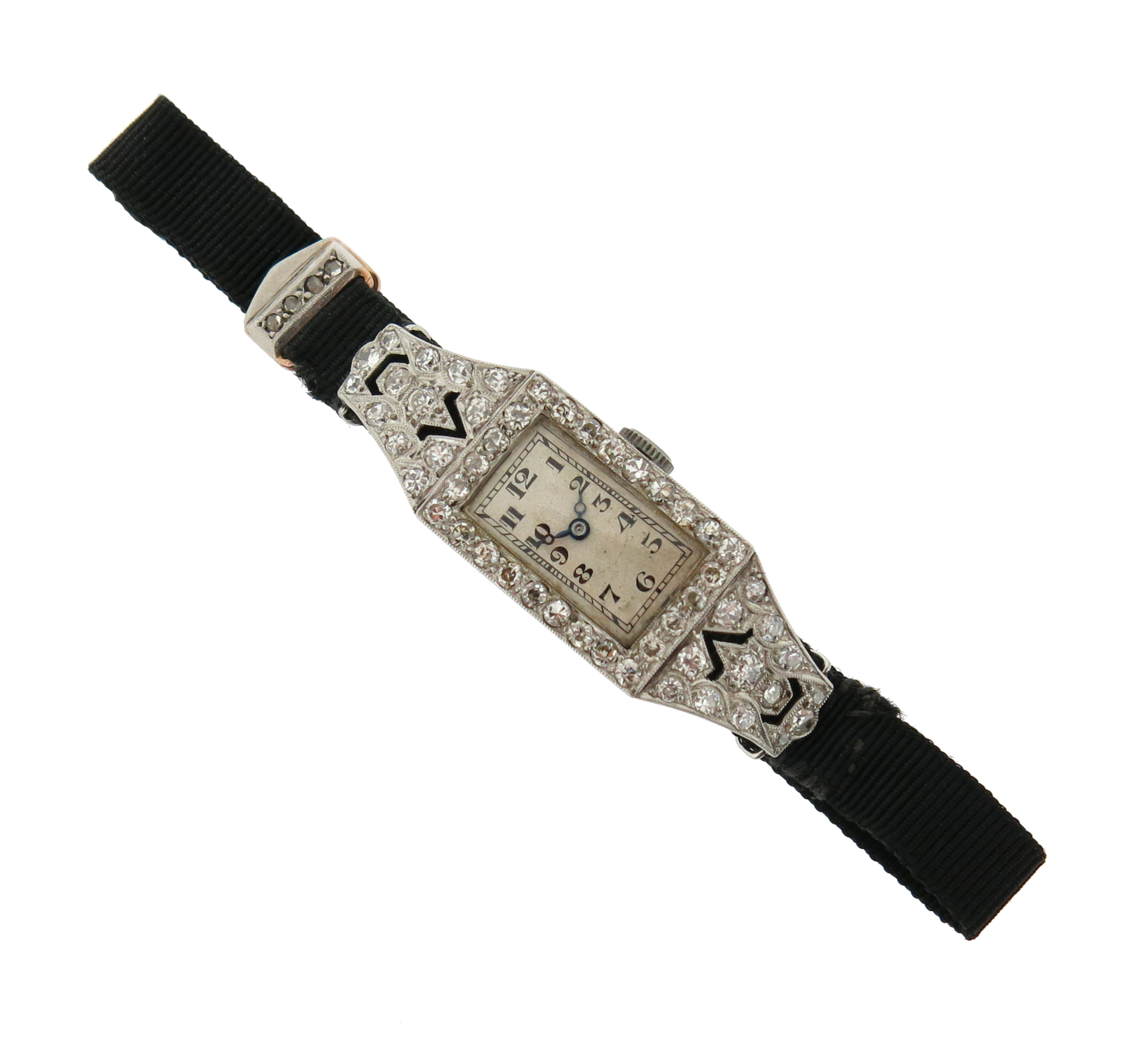 A lady's Art Deco diamond wristwatch, the plain white dial with black Arabic numerals within diamond-set platinum case, on black silk band