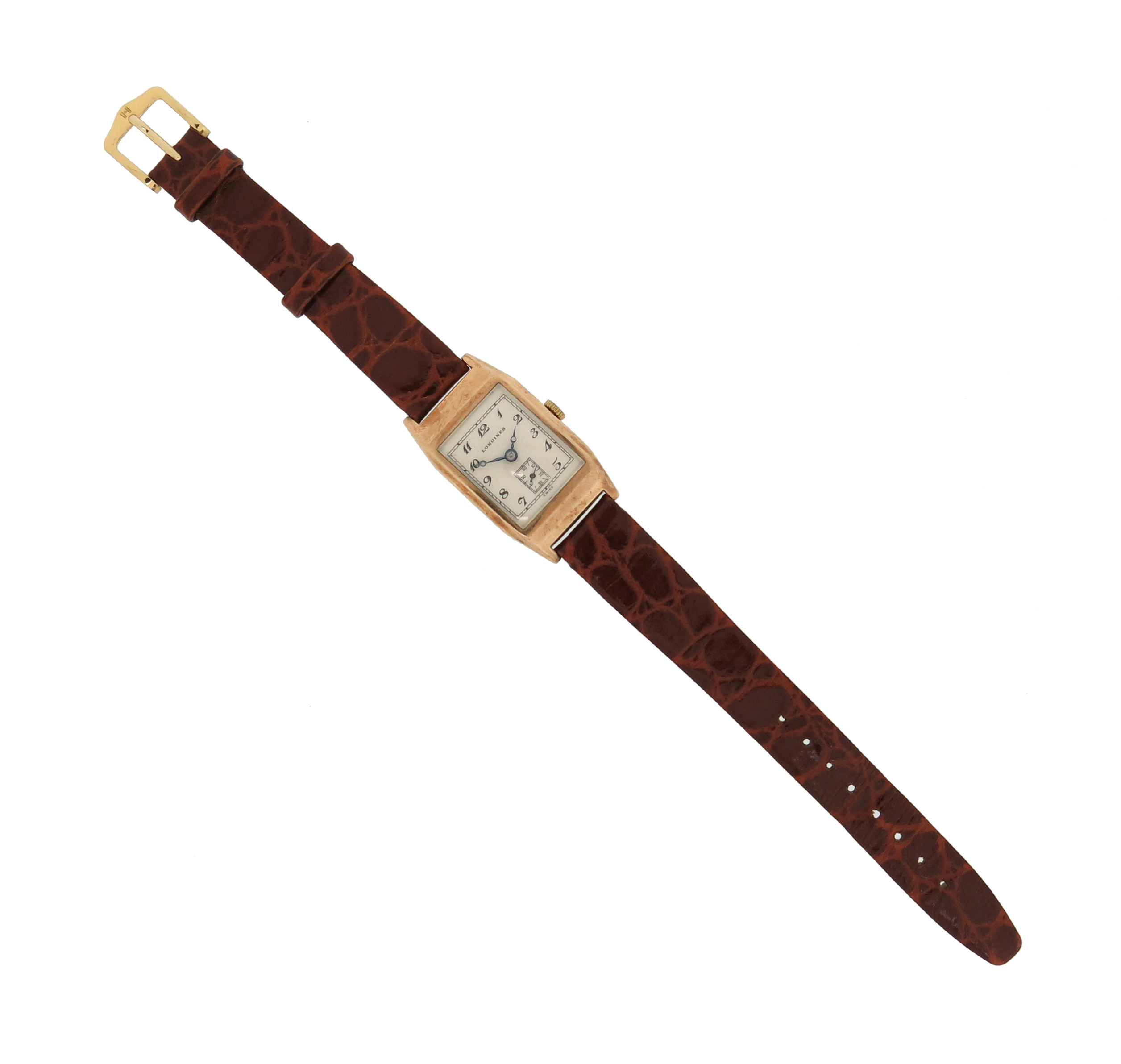 A gentleman's gold wristwatch by Longines, the signed rectangular dial with black Arabic numerals and subsidiary seconds dial, manual movement, inscription to reverse dated 1937, 2.3cm wide