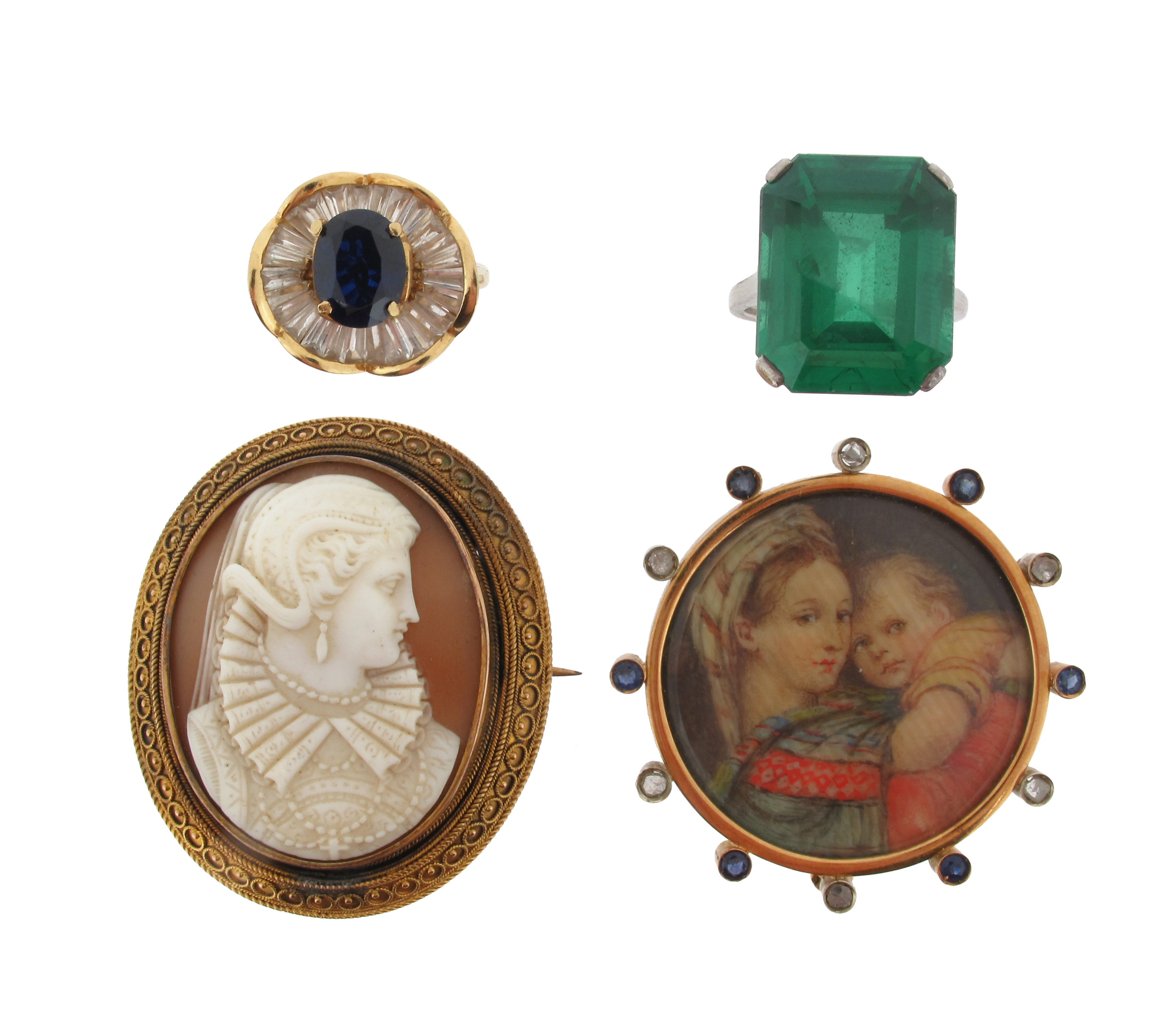 A Victorian shell cameo brooch, within Etruscan Revival gold frame, a circular gold portrait brooch within a surround of sapphires and diamonds, a blue and white stone ring and a green glass ring