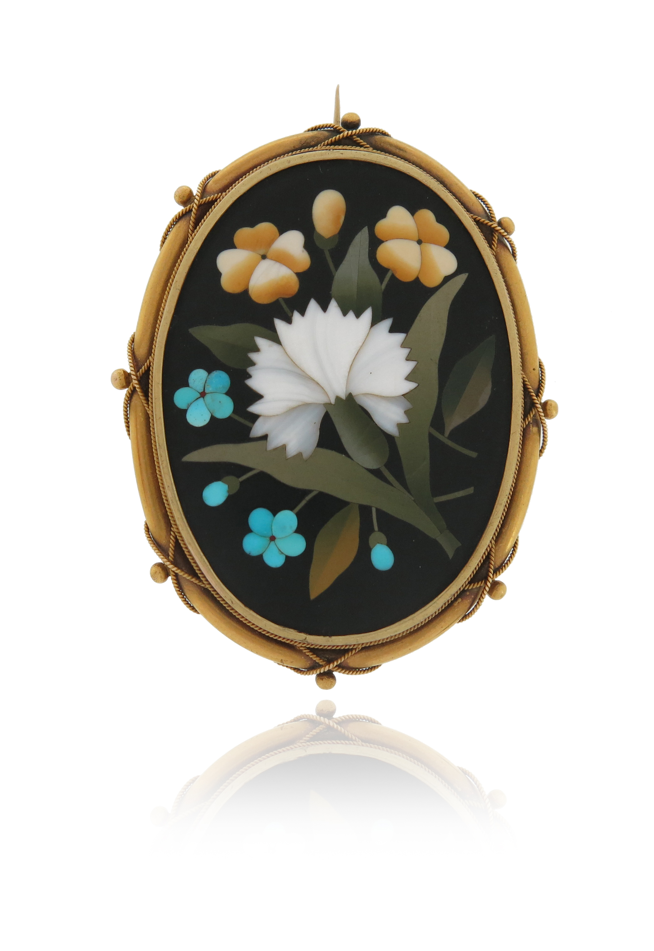 A Victorian pietra dura brooch, the oval plaque depicting a carnation, forget-me-nots and primroses within gold ropetwist and pellet border and mother-of-pearl backing, 6.6cm high