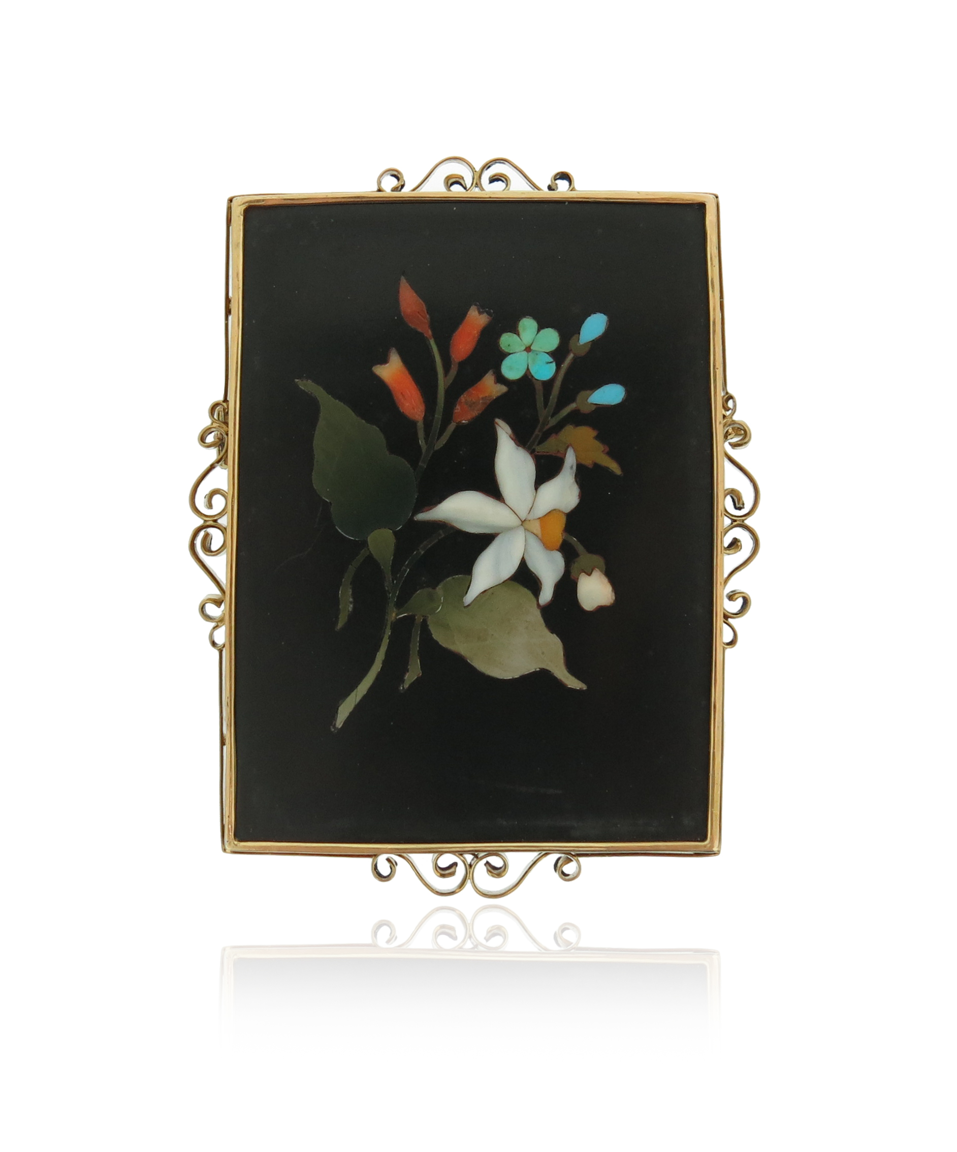 A Victorian pietra dura brooch, the rectangular plaque depicting flowers in hardstone within yellow gold scrolling border, 7.2cm high