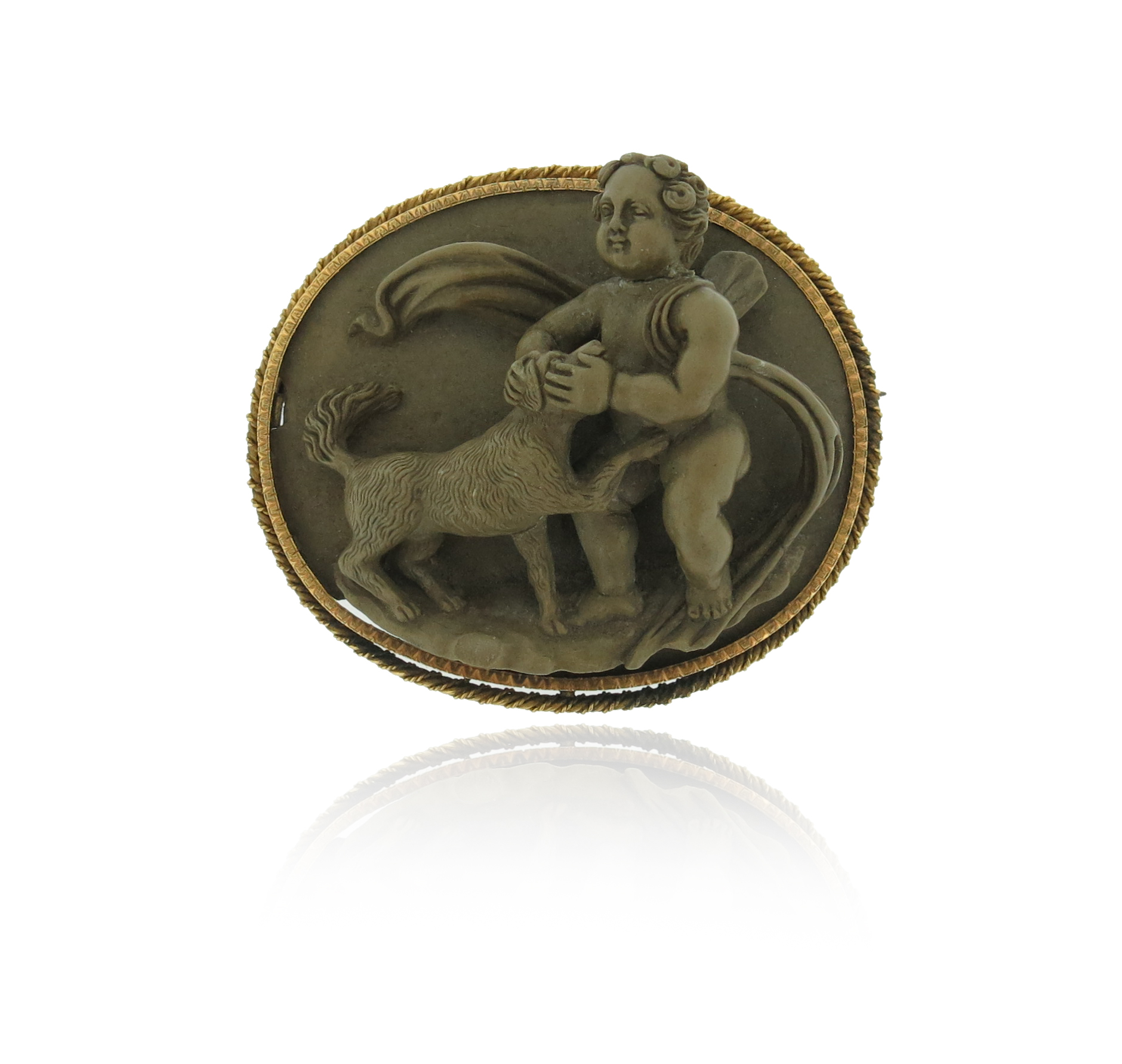 A Victorian carved lava cameo brooch, depicting a cherub (damaged) with a dog, in gold frame, 6cm wide