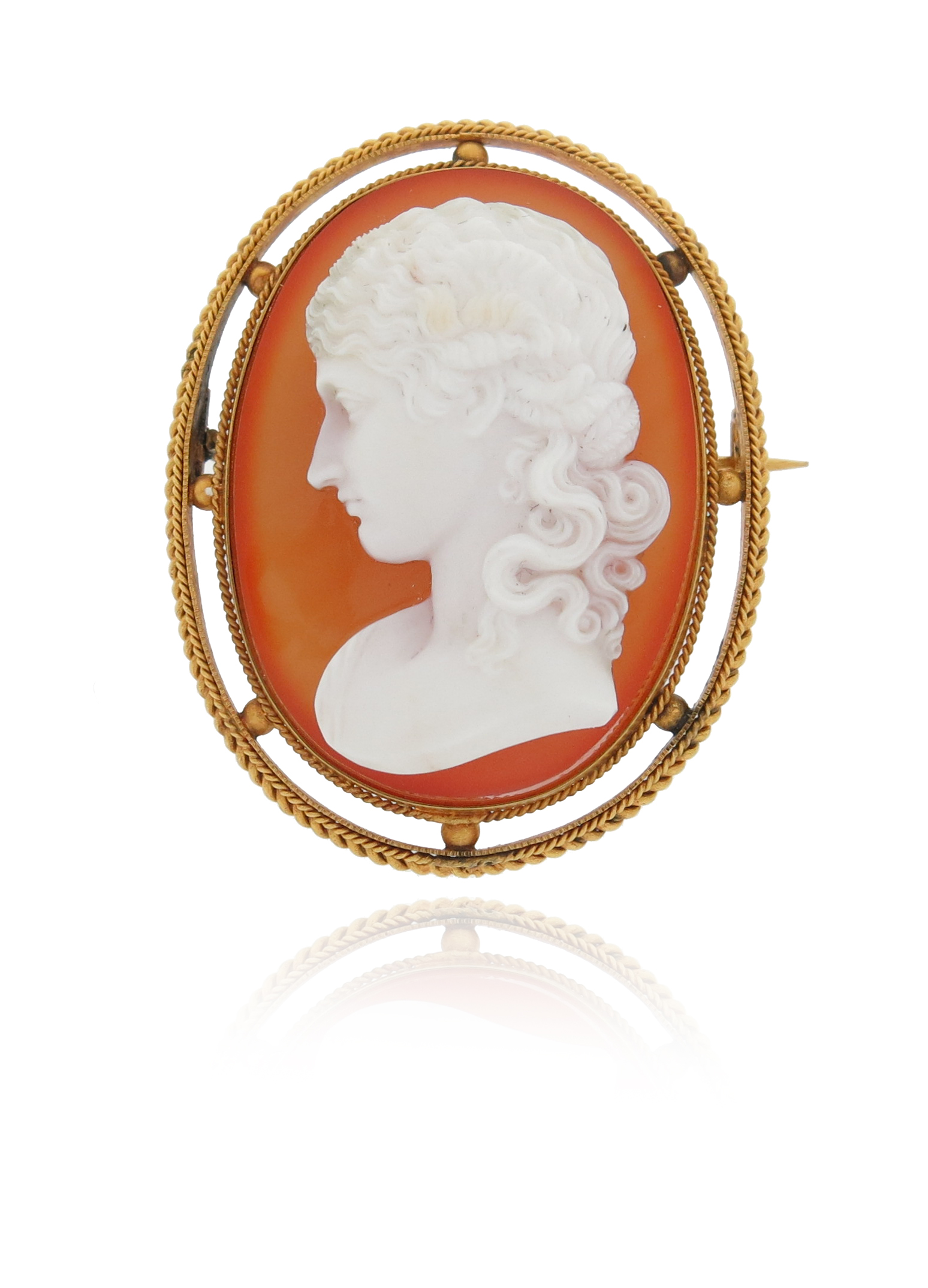 A Victorian hardstone cameo brooch, depicting Clytie in profile with hair flowing to her shoulders, the openwork gold brooch with ropetwist decoration, 4.7cm high
