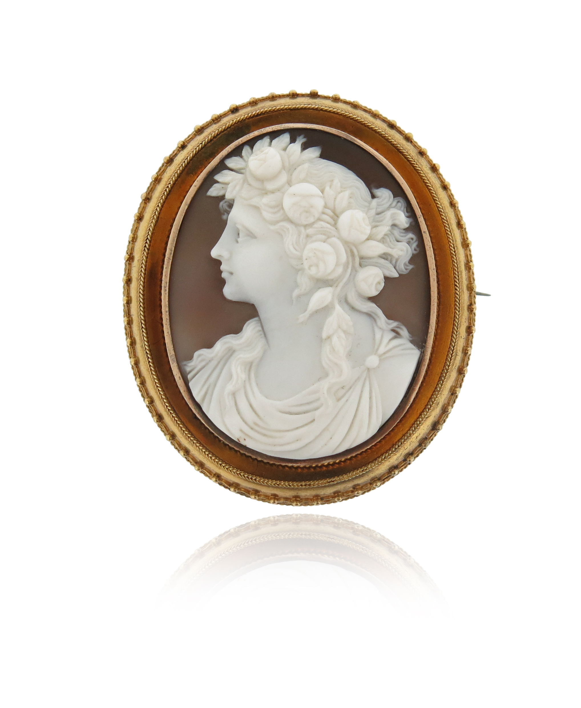 A Victorian shell cameo brooch, depicting Flora in profile, within twisted rope and pellet yellow gold border, glazed locket to reverse, pendant loop, 5.5cm high