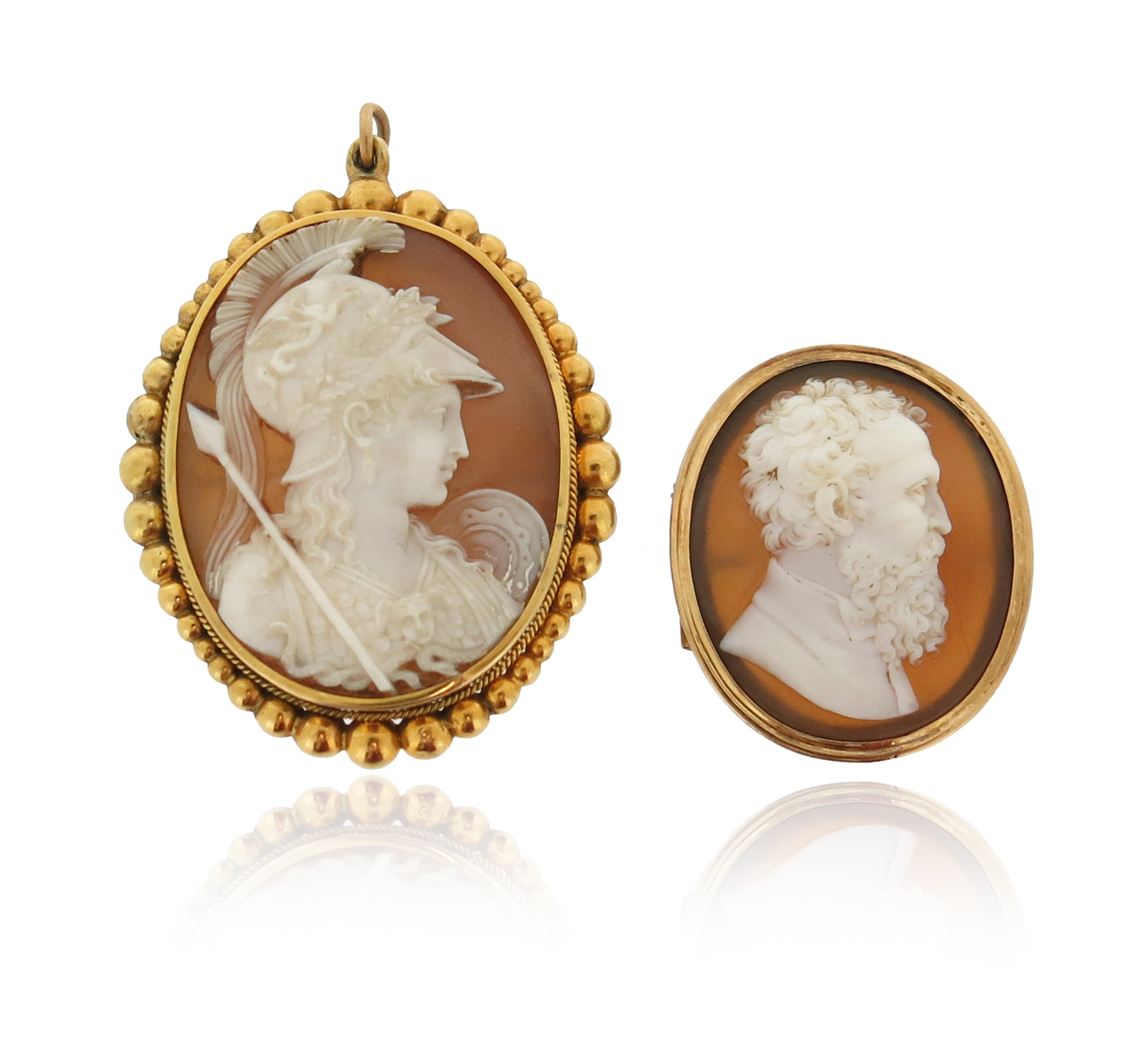 A Victorian shell cameo brooch depicting Michelangelo, in a yellow gold frame, 3.7cm high, with a Victorian shell cameo brooch depicting Athena in gilded pellet frame, 5.5cm wide