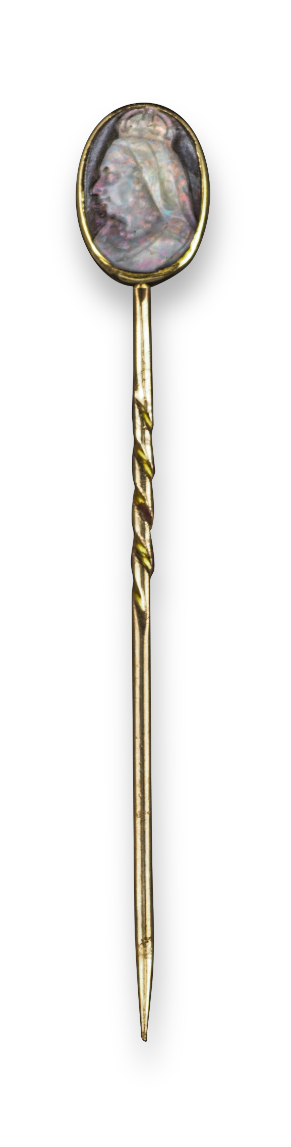 A late 19th century carved boulder opal intaglio of Queen Victoria, probably by Wilhelm Schmidt, mounted in a yellow gold stick pin, cameo 12mm high, stickpin 6.3cm wide