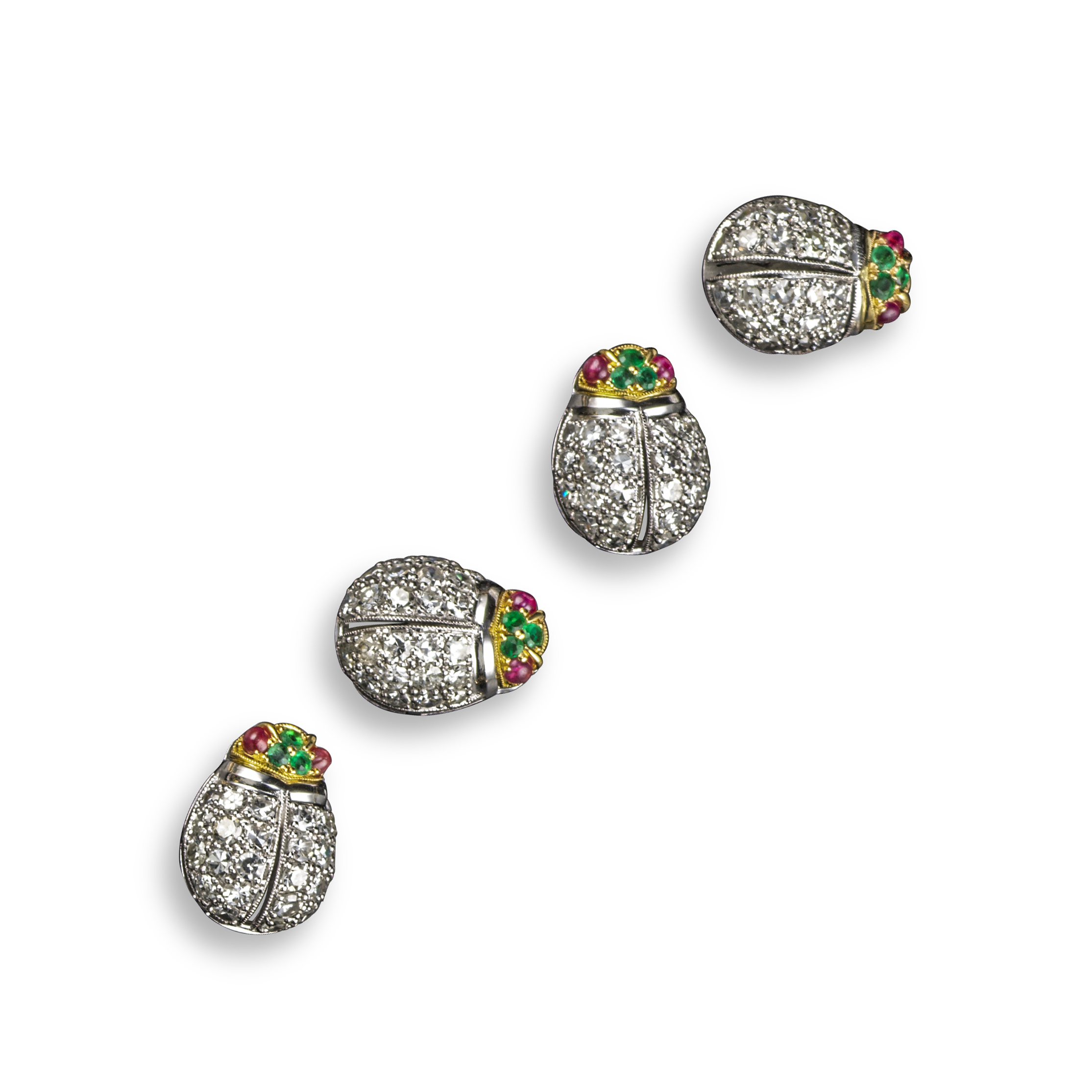 A pair of gem-set ladybird cufflinks, the wings pavé-set with circular-cut diamonds, with cabochon ruby eyes and further circular-cut emeralds to the heads in yellow and white gold, each link 1.4cm high