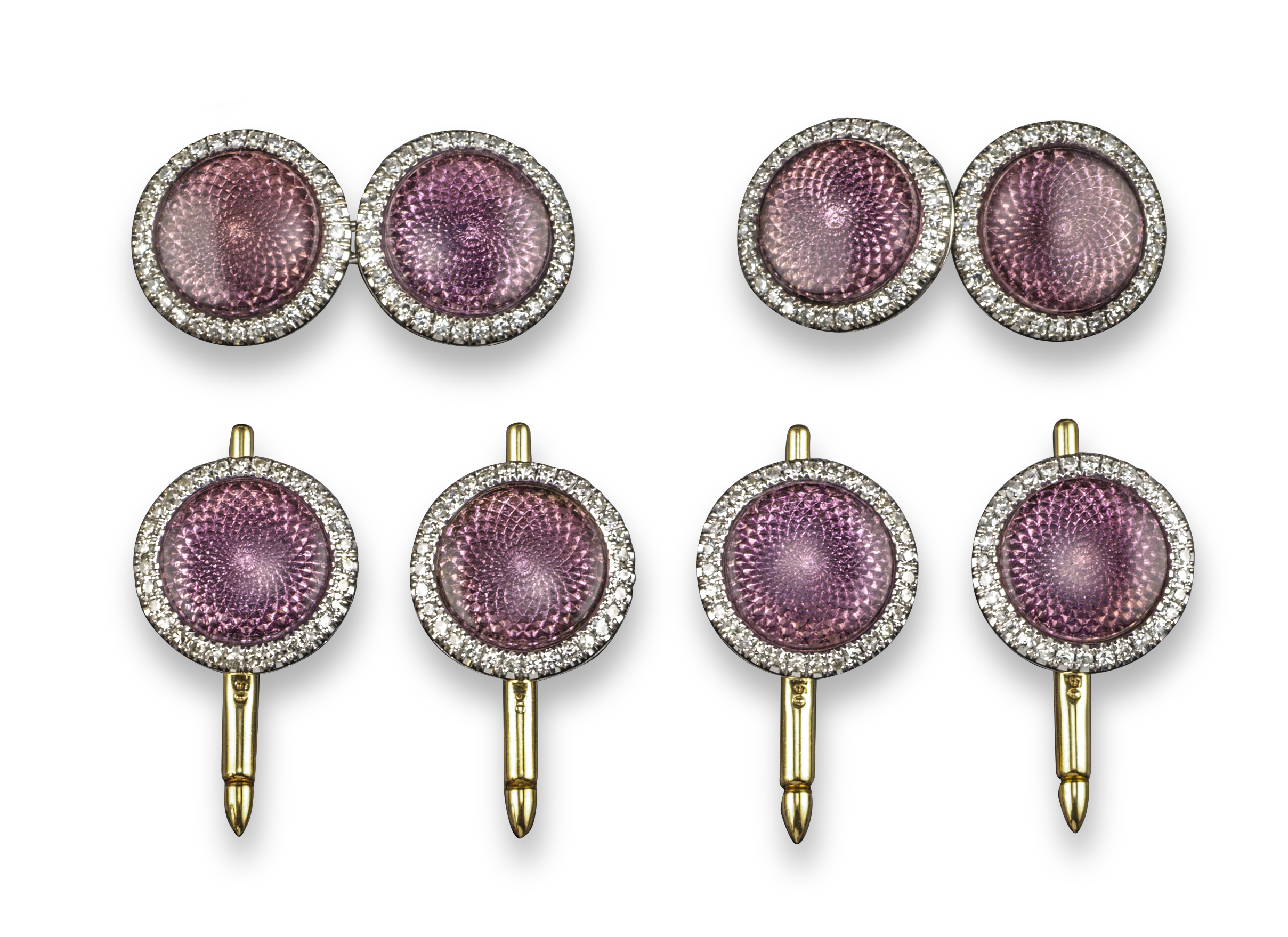 A lilac enamel dress set, the purple guilloche enamel set within a surround of round brilliant-cut diamonds in white gold, with four matching buttons