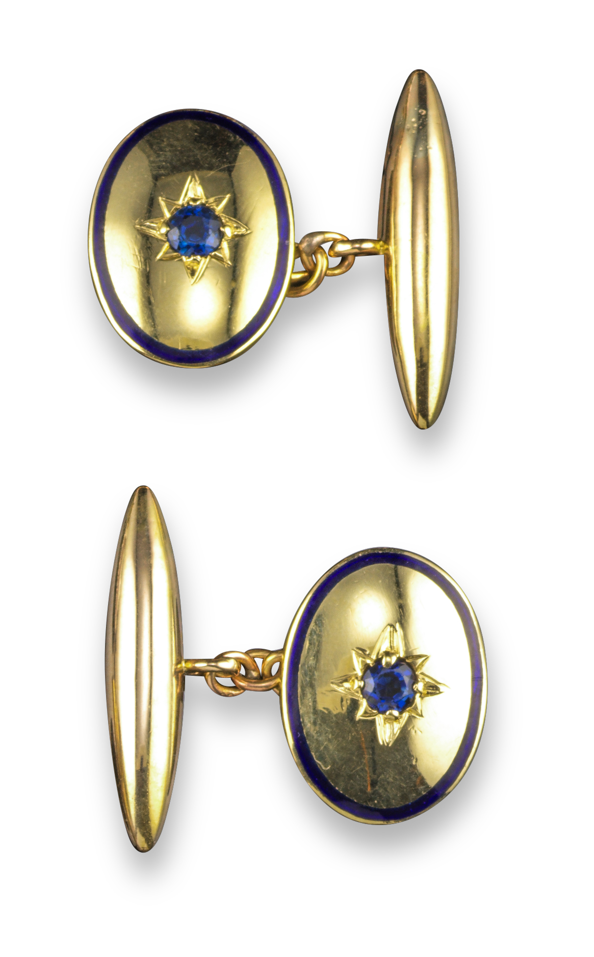 A pair of sapphire-set 18ct gold cufflinks, each oval link centred with a circular-cut sapphire within a border of blue enamel, joined with a gold torpedo link, Birmingham hallmarks for 1987