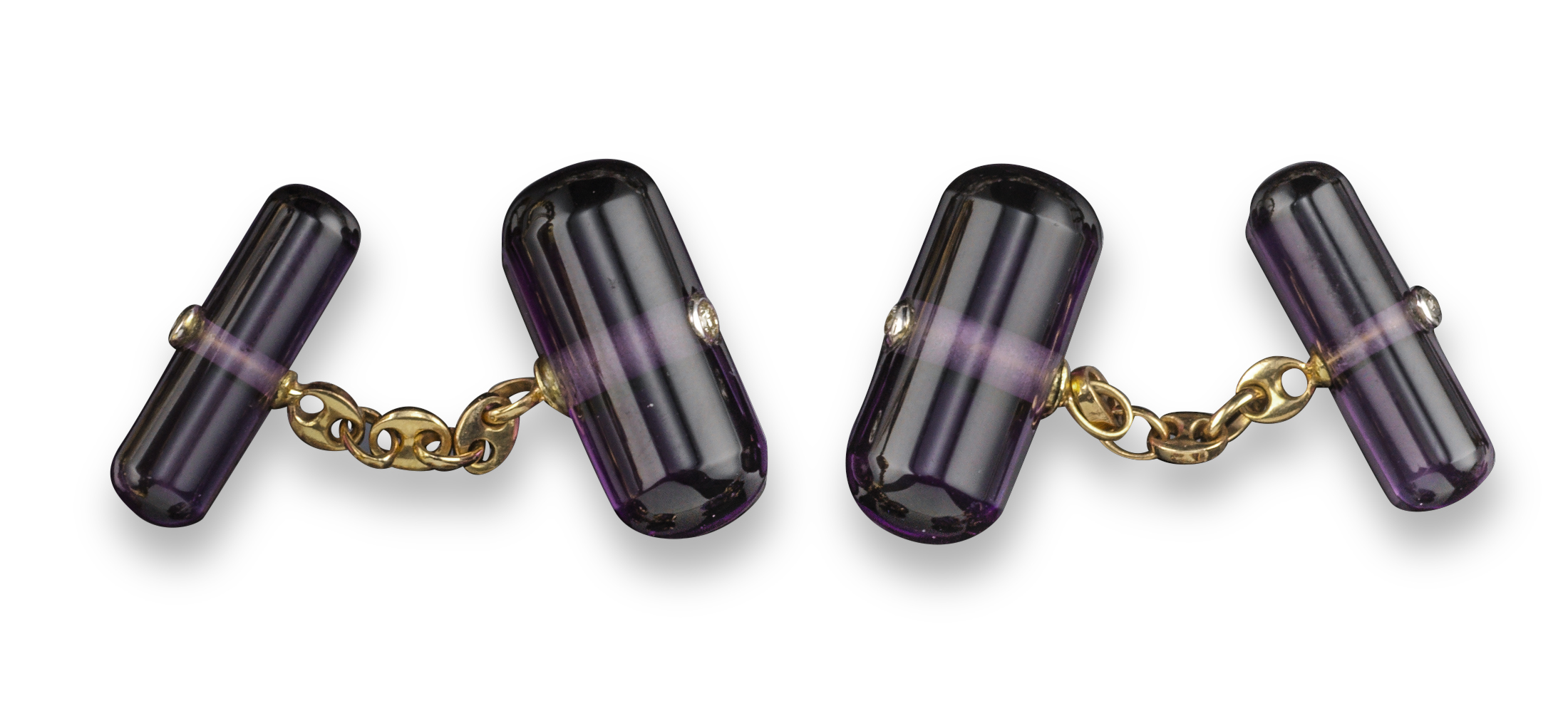 A pair of amethyst baton and diamond cufflinks, joined with anchor-link gold chains