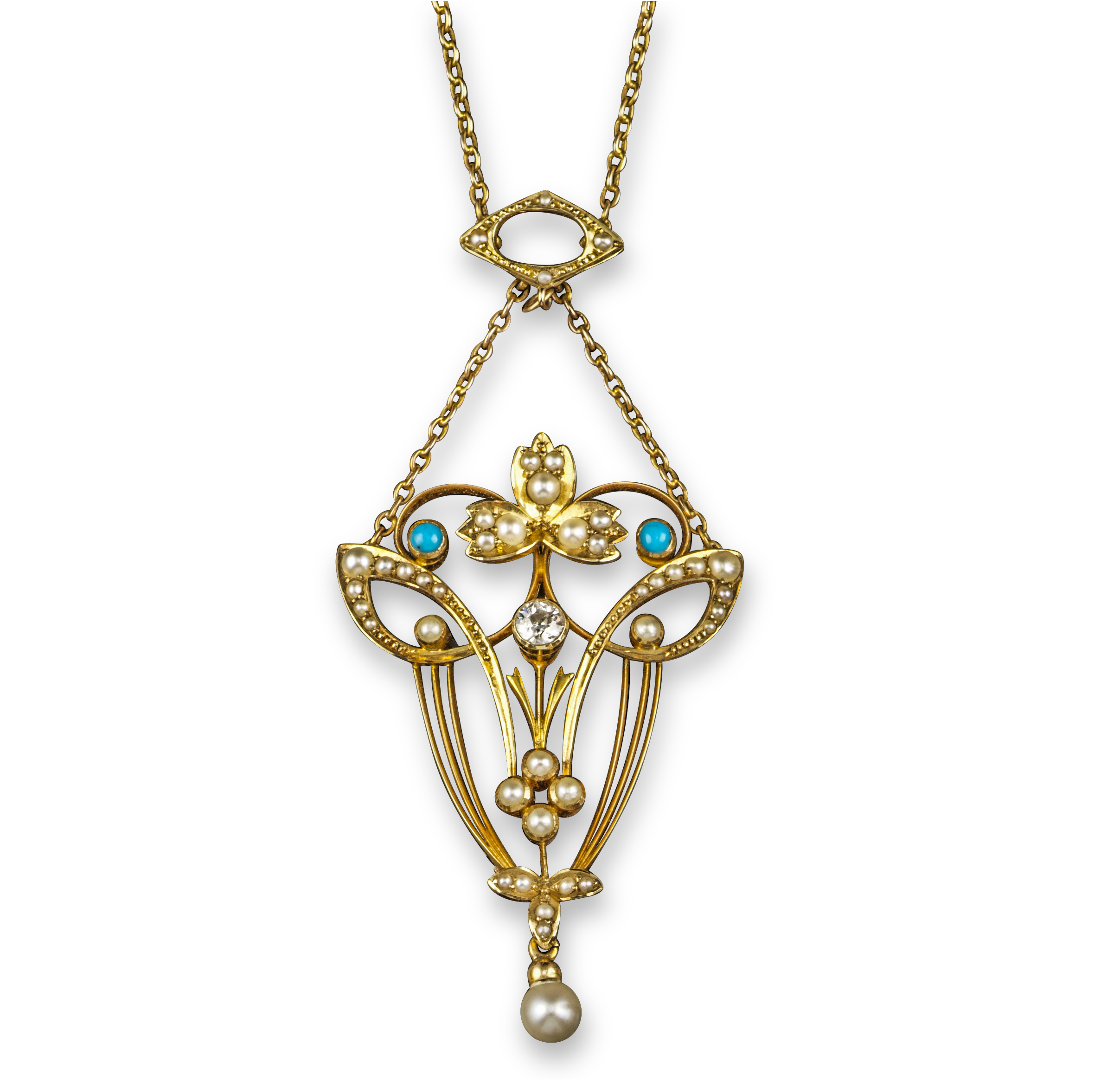 An Art Nouveau seed pearl, diamond and turquoise gold pendant, of openwork foliate design, centred with a circular-cut diamond and suspending an untested pearl, 4.5cm high, on a fine-link gold neck chain, 38cm long, fitted case