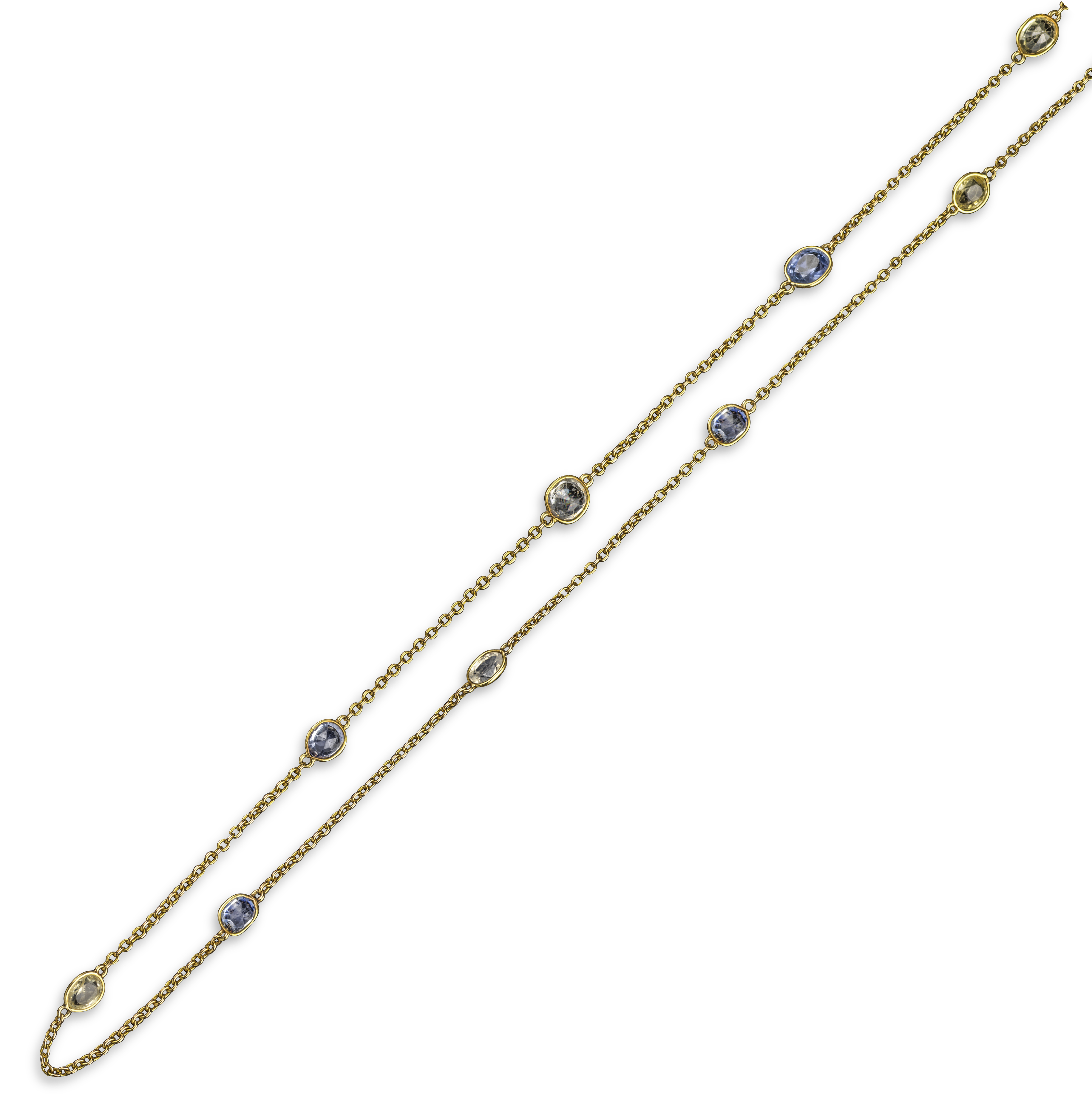 An Edwardian sapphire-set gold longuard chain, set with cushion-shaped blue and yellow sapphires in yellow gold spectacle mounts, on a gold neck chain, 142cm long