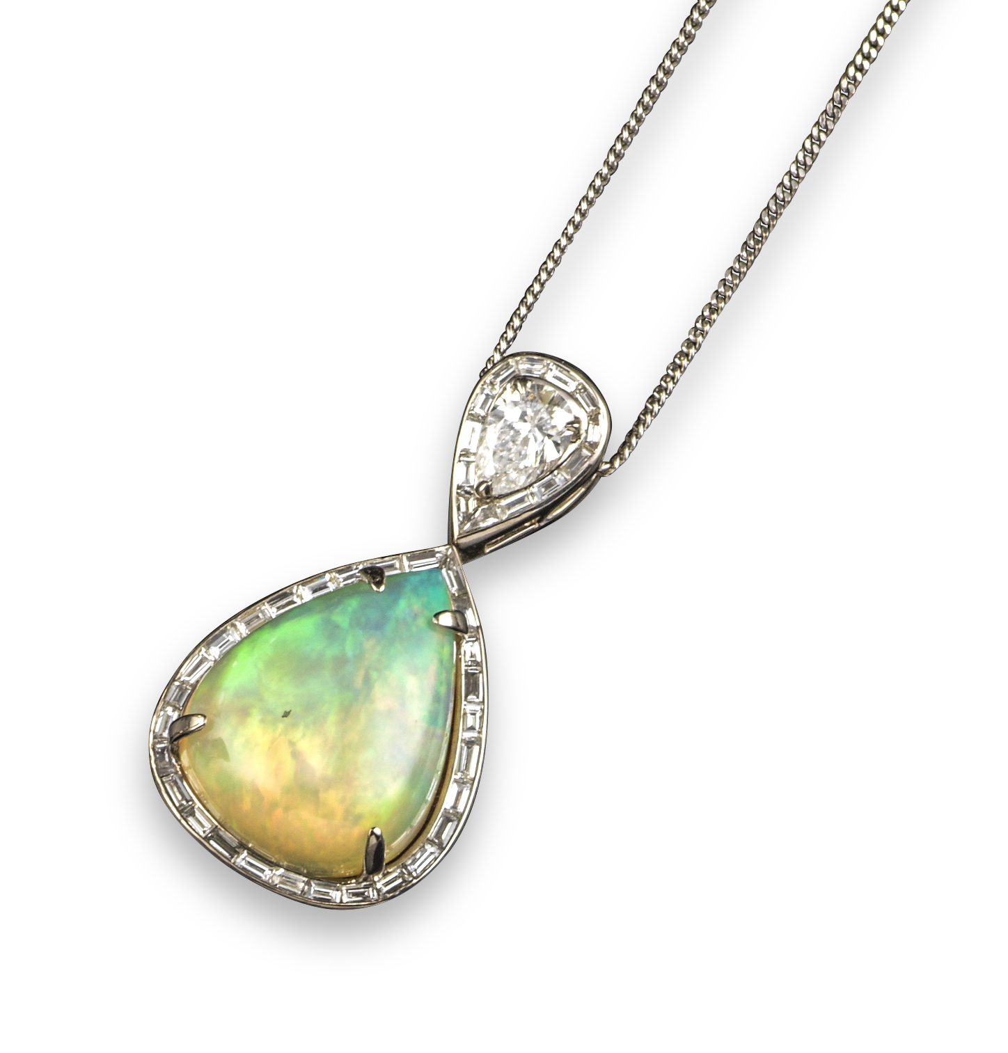 An opal and diamond pendant, the pear-shaped cabochon opal is set within a border of baguette-shaped diamonds, suspended from a pear-shaped diamond surmount in white gold, pendant 3cm high, white gold chain 45cm long