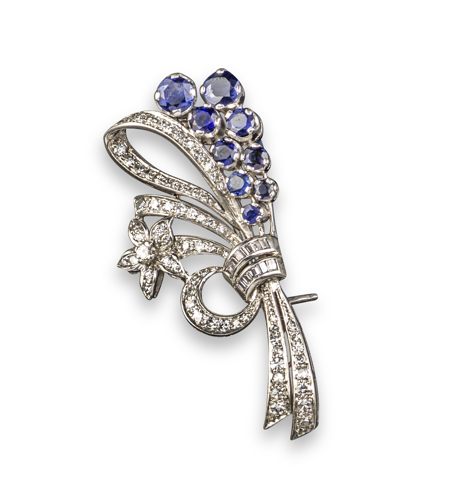 A sapphire and diamond spray brooch, set with graduated circular-cut sapphires and diamonds forming a posy of flowers, tied with baguette-shaped diamond ribbon in white gold, 4.5cm high