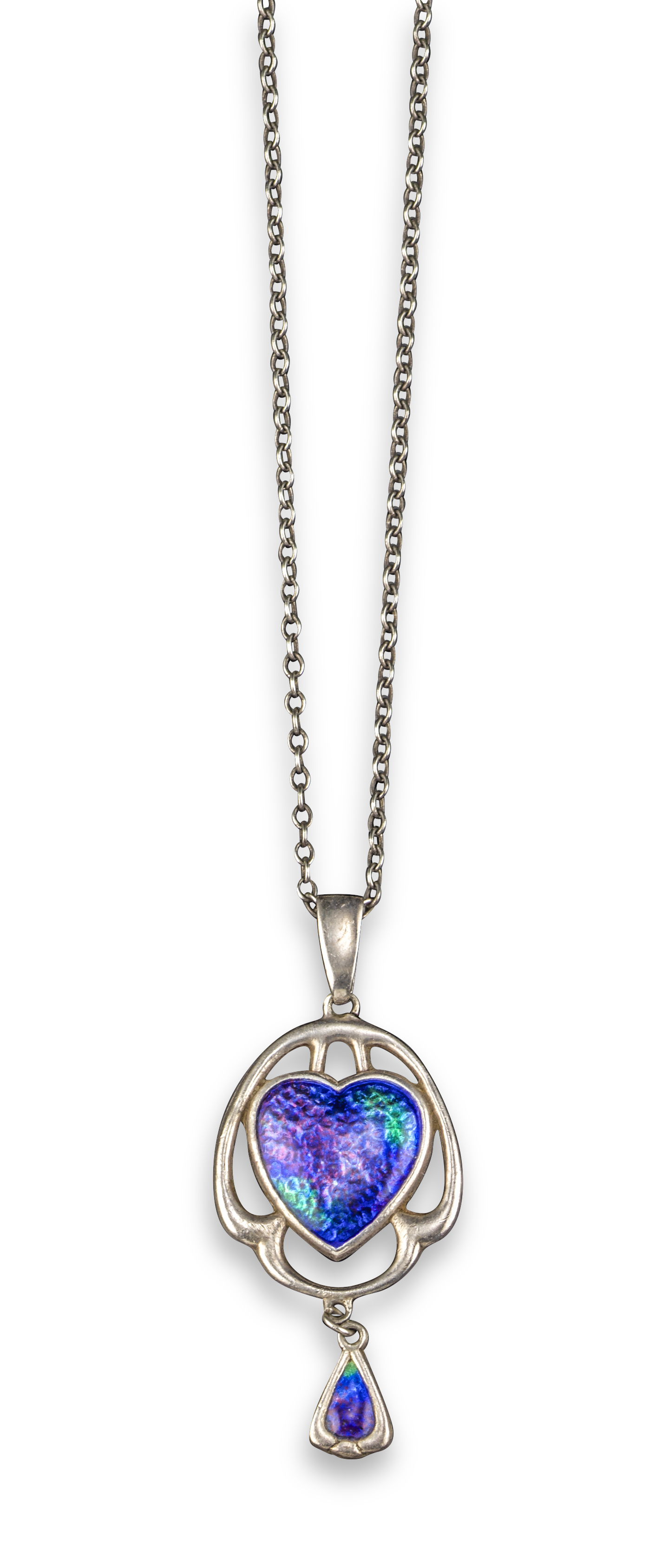 A silver and enamel pendant by Charles Horner, centred with an enamel heart and suspending a silver and enamel drop, Chester hallmarks for 1923 and with maker's mark, on a fine-link silver neckchain, 48cm long