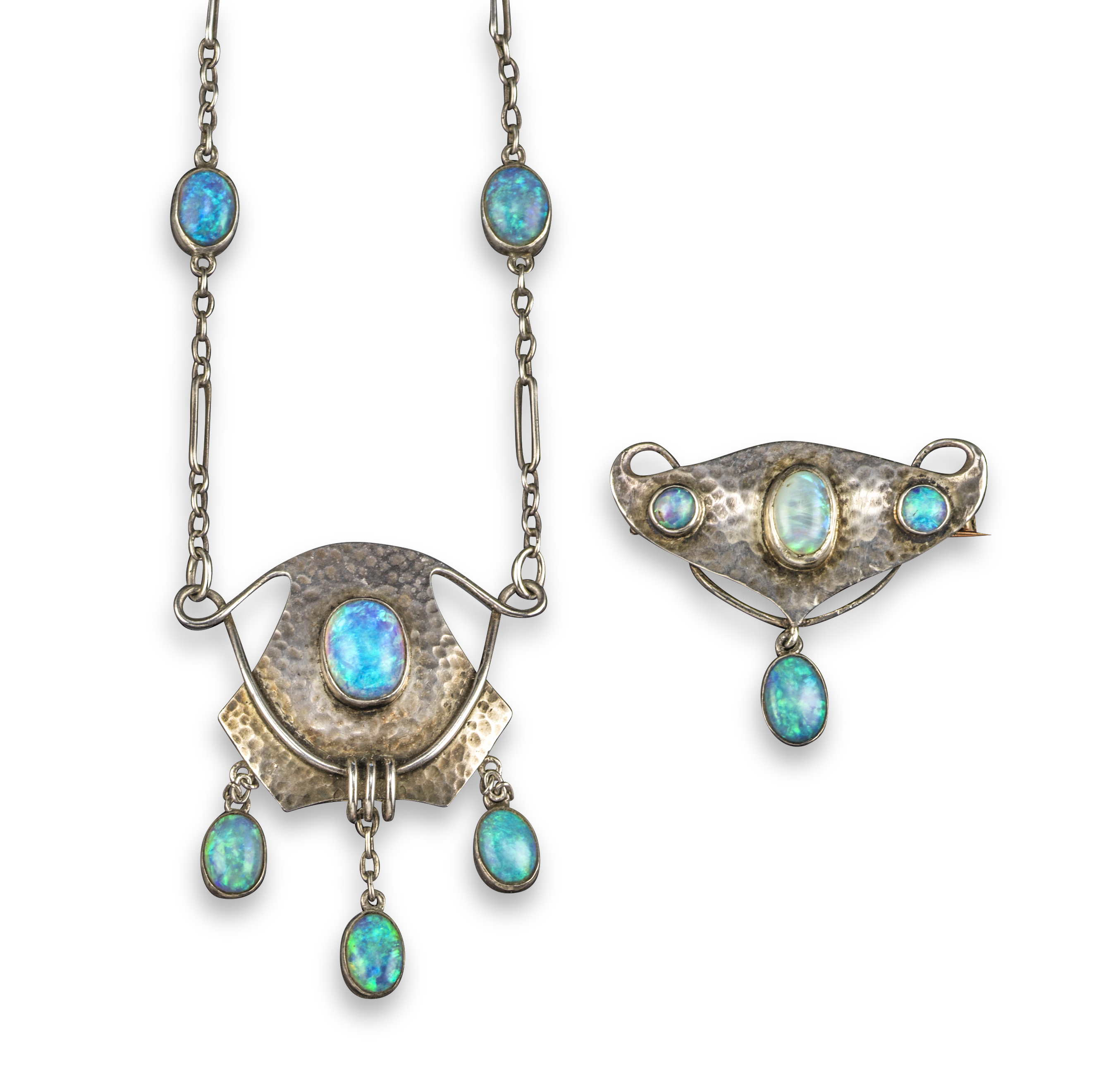 An opal-set silver pendant and matching brooch by Murrle Bennett & Co